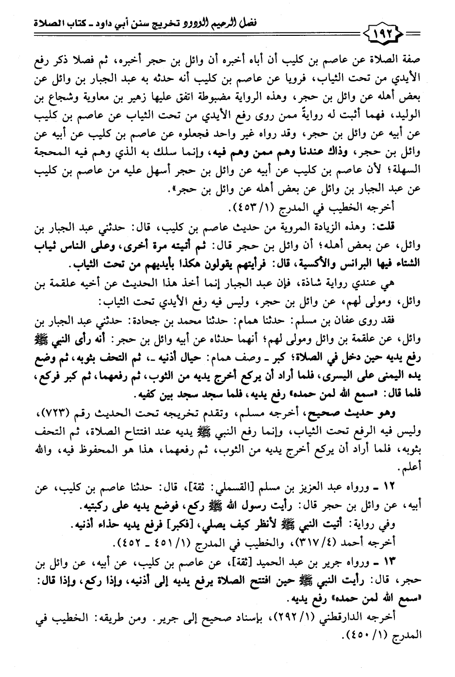 صفة الصلاة عن عاصم بن كليب أن أباه أخبره أن وائل بن حجر أخبره، ثم فصلا ذكر رفع الأيدي من تحت الثياب، فرويا عن عاصم بن كليب أنَّه حدثه به عبد الجبار بن وائل عن بعض أهله عن وائل بن حجر، وهذه الرواية مضبوطة اتفق عليها زهير بن معاوية وشجاع بن الوليد، فهما أثبت له روايةً ممن روى رفع الأيدي من تحت الثياب عن عاصم بن كليب عن أبيه عن وائل بن حجر، وقد رواه غير واحد فجعلوه عن عاصم بن كليب عن أبيه عن وائل بن حجر، وذاك عندنا وهم ممن وهم فيه، وإنما سلك به الَّذي وهم فيه المحجة السهلة؛ لأنَّ عاصم بن كليب عن أبيه عن وائل بن حجر أسهل عليه من عاصم بن كليب عن عبد الجبار بن وائل عن بعض أهله عن وائل بن حجر".