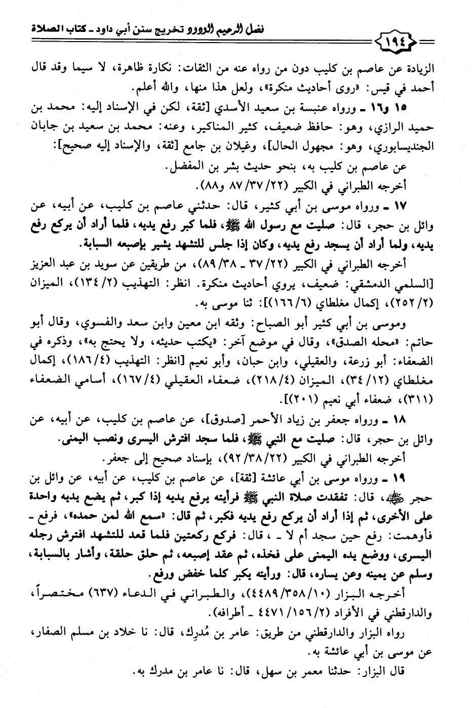 ١٩ - ورواه موسى بن أبي عائشة [ثقة]، عن عاصم بن كليب، عن أبيه، عن وائل بن حجر - رضي الله عنه -، قال: تفقدت صلاة النبي - صلى الله عليه وسلم - فرأيته يرفع يديه إذا كبر، ثم يضع يديه واحدة على الأخرى، ثم إذا أراد أن يركع رفع يديه فكبر، ثم قال: "سمع الله لمن حمده"، فرفع - فأوهمت: رفع حين سجد أم لا -، قال: فركع ركعتين فلما قعد للتشهد افترش رجله اليسرى، ووضع يده اليمنى على فخذه، ثم عقد بإصبعه، ثم حلق حلقة، وأشار بالسبابة، وسلم عن يمينه وعن يساره، قال: ورأيته يكبر كلما خفض ورفع.