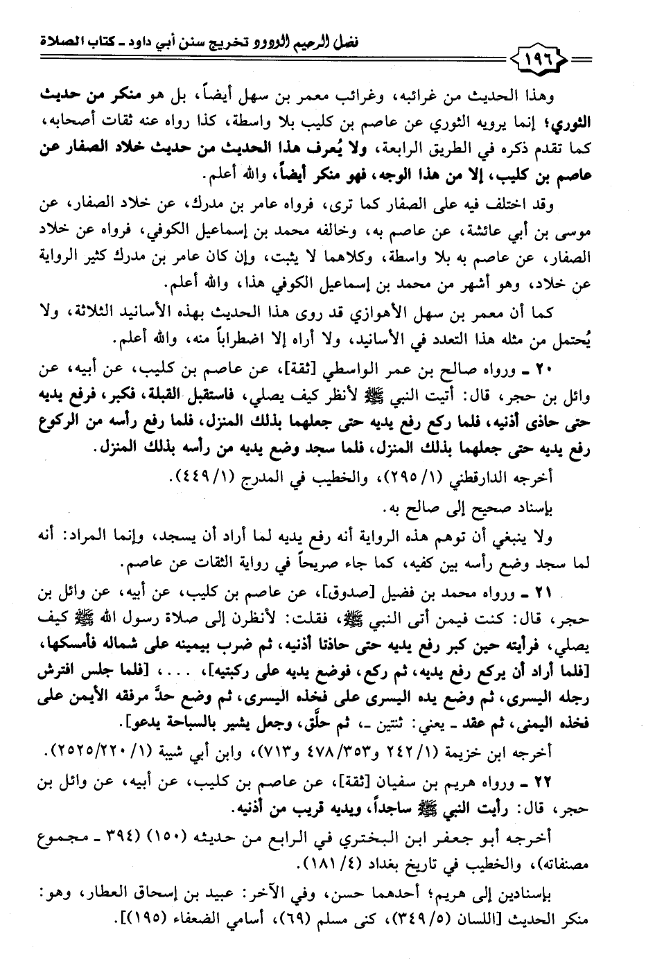 ٢٠ - ورواه صالح بن عمر الواسطي [ثقة]، عن عاصم بن كليب، عن أبيه، عن وائل بن حجر، قال: أتيت النبي - صلى الله عليه وسلم - لأنظر كيف يصلي، فاستقبل القبلة، فكبر، فرفع يديه حتَّى حاذى أذنيه، فلما ركع رفع يديه حتَّى جعلهما بذلك المنزل، فلما رفع رأسه من الركوع رفع يديه حتَّى جعلهما بذلك المنزل، فلما سجد وضع يديه من رأسه بذلك المنزل.