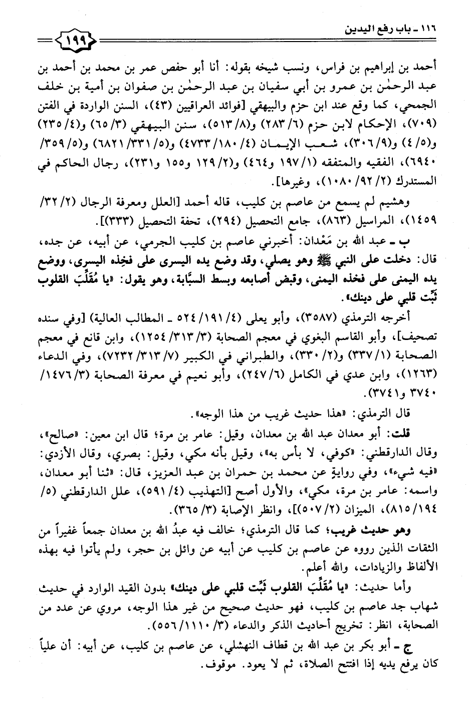 ج - عبد الله بن مَعْدان: أخبرني عاصم بن كليب الجرمي، عن أبيه، عن جده، قال: دخلت على النبي - صلى الله عليه وسلم - وهو يصلي، وقد وضع يده اليسرى على فخِذه اليسرى، ووضع يده اليمنى على فخذه اليمنى، وقبض أصابعه وبسط السبَّابة، وهو يقول: "يا مُقَلِّبَ القلوب ثَبِّت قلبي على دينك".