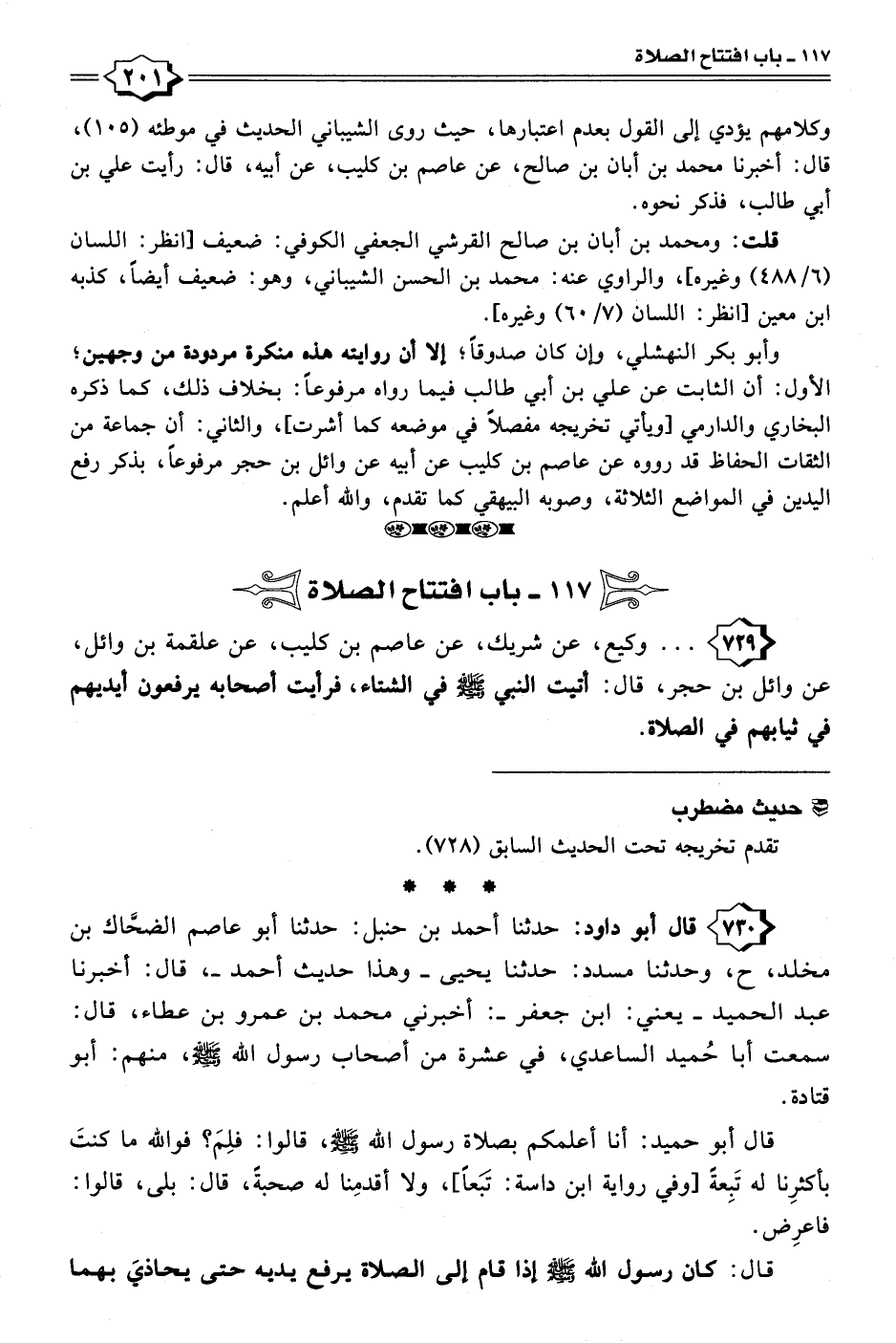 ٧٣٠ - قال أبو داود: حدثنا أحمد بن حنبل: حدثنا أبو عاصم الضحَّاك بن مخلد، ح، وحدثنا مسدد: حدثنا يحيى - وهذا حديث أحمد -، قال: أخبرنا عبد الحميد -يعني: ابن جعفر-: أخبرني محمد بن عمرو بن عطاء، قال: سمعت أبا حُميد الساعدي، في عشرة من أصحاب رسول الله - صلى الله عليه وسلم -، منهم: أبو قتادة.