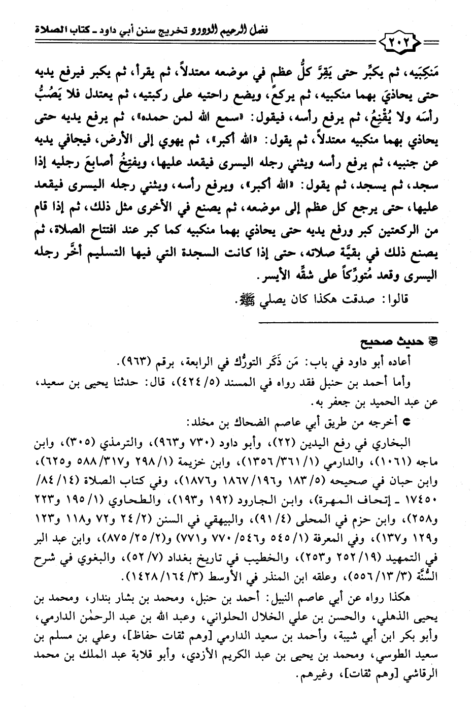 البخاري في رفع اليدين (٢٢)، وأبو داود (٧٣٠ و ٩٦٣)، والترمذي (٣٠٥)، وابن ماجة (١٠٦١)، والدارمي (١/ ٣٦١/ ١٣٥٦)، وابن خزيمة (١/ ٢٩٨ و ٣١٧/ ٥٨٨ و ٦٢٥)، وابن حبان في صحيحه (٥/ ١٨٣ و ١٩٦/ ١٨٦٧ و ١٨٧٦)، وفي كتاب الصلاة (١٤/ ٨٤/ ١٧٤٥٠ - إتحاف المهرة)، وابن الجارود (١٩٢ و ١٩٣)، والطحاوي (١/ ١٩٥ و ٢٢٣ و ٢٥٨)، وابن حزم في المحلى (٤/ ٩١)، والبيهقي في السنن (٢/ ٢٤ و ٧٢ و ١١٨ و ١٢٣ و ١٢٩ و ١٣٧)، وفي المعرفة (١/ ٥٤٥ و ٥٤٦/ ٧٧٠ و ٧٧١) و (٢/ ٢٥/ ٨٧٥)، وابن عبد البر في التمهيد (١٩/ ٢٥٢ و ٢٥٣)، والخطيب في تاريخ بغداد (٧/ ٥٢)، والبغوي في شرح السُّنَّة (٣/ ١٣/ ٥٥٦)، وعلقه ابن المنذر في الأوسط (٣/ ١٦٤ / ١٤٢٨).