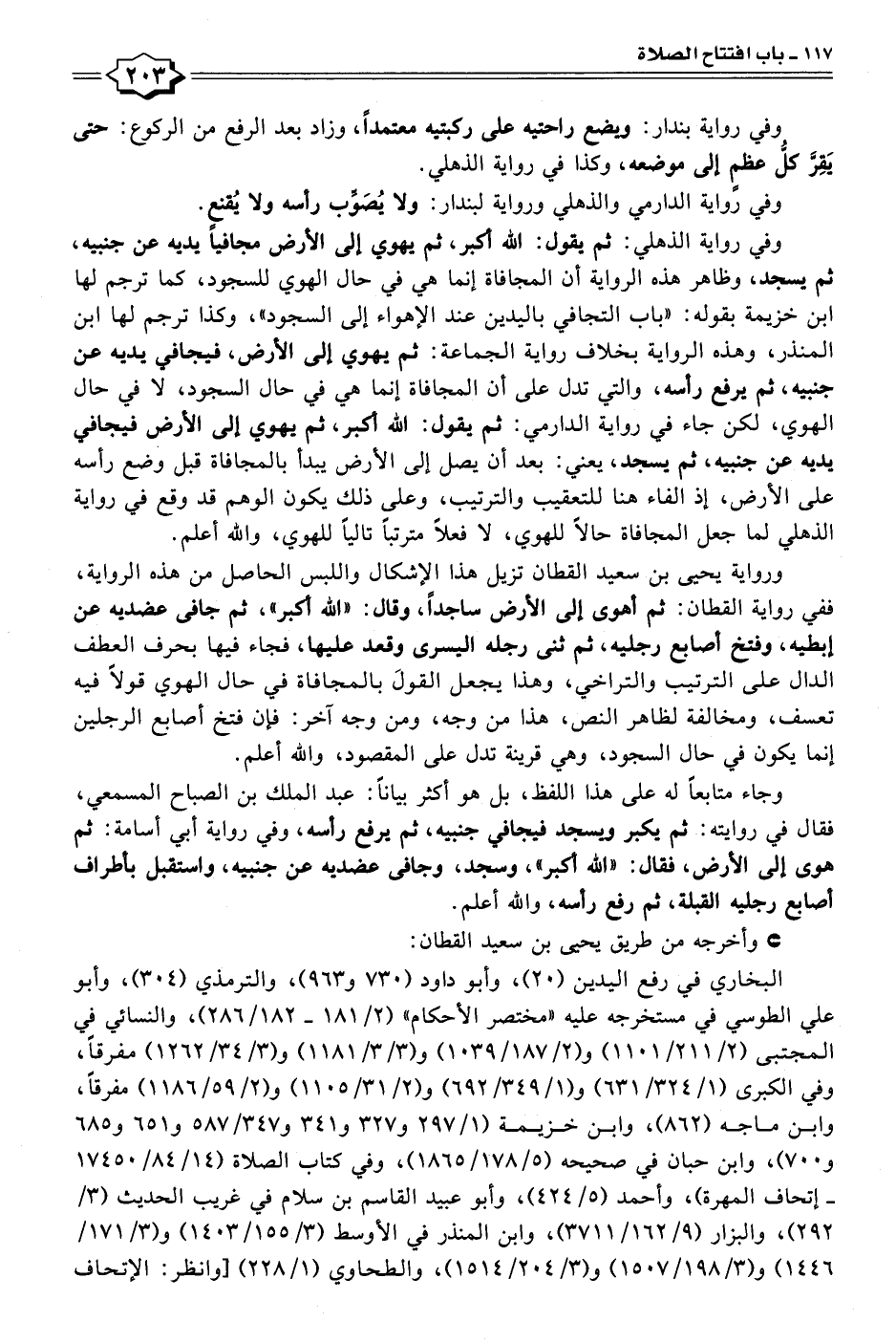 ورواية يحيى بن سعيد القطان تزيل هذا الإشكال واللبس الحاصل من هذه الرواية، ففي رواية القطان: ثم أهوى إلى الأرض ساجدًا، وقال: "الله أكبر"، ثم جافى عضديه عن إبطيه، وفتخ أصابع رجليه، ثم ثنى رجله اليسرى وقعد عليها، فجاء فيها بحرف العطف الدال على الترتيب والتراخي، وهذا يجعل القولًا بالمجافاة في حال الهوي قولًا فيه تعسف، ومخالفة لظاهر النص، هذا من وجه، ومن وجه آخر: فإن فتخ أصابع الرجلين إنما يكون في حال السجود، وهي قرينة تدل على المقصود، والله أعلم.