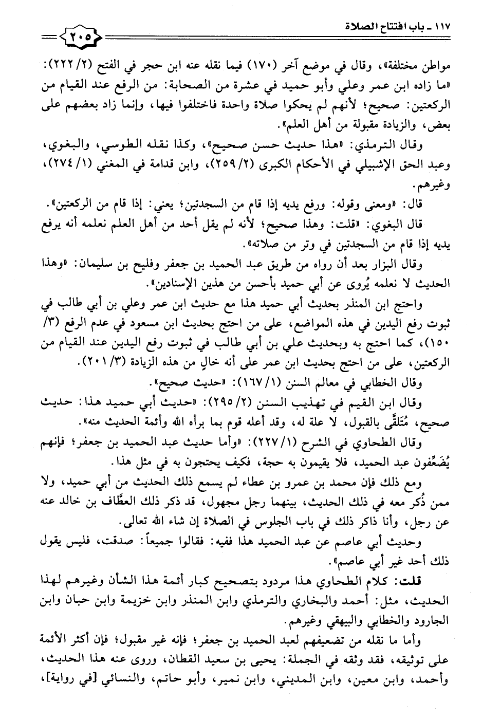مواطن مختلفة"، وقال في موضع آخر (١٧٠) فيما نقله عنه ابن حجر في الفتح (٢/ ٢٢٢): "ما زاده ابن عمر وعلي وأبو حميد في عشرة من الصحابة: من الرفع عند القيام من الركعتين: صحيح؛ لأنهم لم يحكوا صلاة واحدة فاختلفوا فيها، وإنما زاد بعضهم على بعض، والزيادة مقبولة من أهل العلم".
