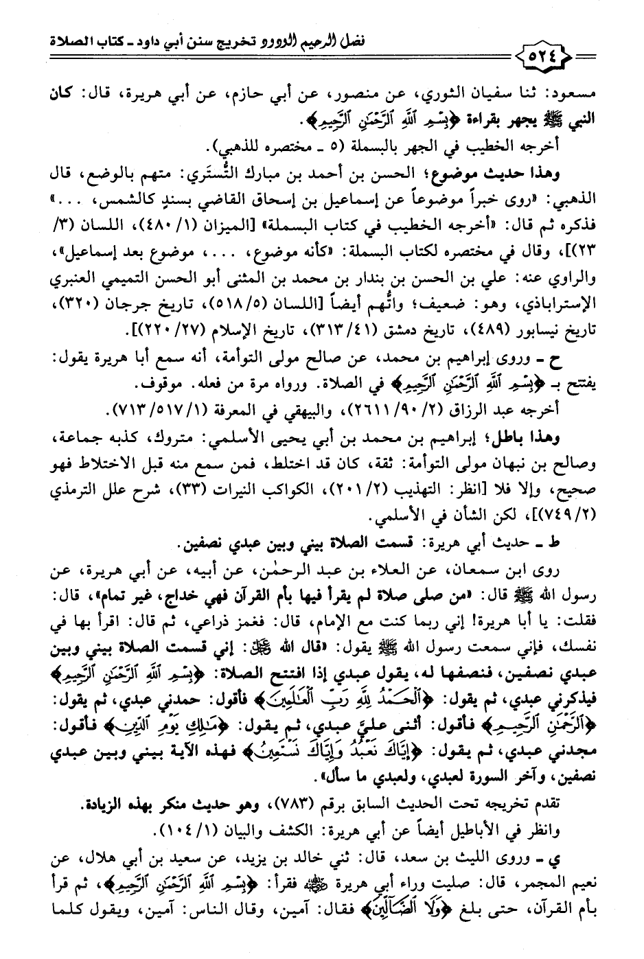 ح- وروى إبراهيم بن محمد، عن صالح مولى التوأمة، أنه سمع أبا هريرة يقول: يفتتح بـ {بِسْمِ اللَّهِ الرَّحْمَنِ الرَّحِيمِ} في الصلاة. ورواه مرة من فعله. موقوف.
