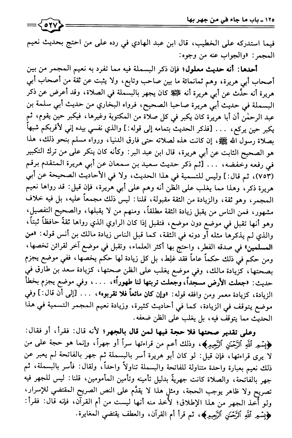 أحدهما: أنه حديث معلول؛ فإن ذكر البسملة فيه مما تفرد به نعيم المجمر من بين أصحاب أبي هريرة، وهم ثمانمائة ما بين صاحب وتابع، ولا يثبت عن ثقة من أصحاب أبي هريرة أنه حدَّث عن أبي هريرة أنه عليه السلام كان يجهر بالبسملة في الصلاة، وقد أعرض عن ذكر البسملة في حديث أبي هريرة صاحبا الصحيح، فرواه البخاري من حديث أبي سلمة بن عبد الرحمن أن أبا هريرة كان يكبر في كل صلاة من المكتوبة وغيرها، فيكبر حين يقوم، ثم يكبر حين يركع،. . . [فذكر الحديث بتمامه إلى قوله:] والذي نفسي بيده إني لأقربكم شبهًا بصلاة رسول الله - صلى الله عليه وسلم -، إن كانت هذه لصلاته حتى فارق الدنيا، ورواه مسلم بنحو ذلك، هذا هو الصحيح الثابت عن أبي هريرة، قال ابن عبد البر: وكأنه كان ينكر على من ترك التكبير في رفعه وخفضه،. . . [ثم ذكر حديث سعيد بن سمعان عن أبي هريرة المتقدم برقم (٧٥٣)، ثم قال:] وليس للتسمية في هذا الحديث، ولا في الأحاديث الصحيحة عن أبي هريرة ذكر، وهذا مما يغلب على الظن أنه وهم على أبي هريرة، فإن قيل: قد رواها نعيم المجمر، وهو ثقة، والزيادة من الثقة مقبولة، قلنا: ليس ذلك مجمعًا عليه، بل فيه خلاف مشهور، فمن الناس من يقبل زيادة الثقة مطلقًا، ومنهم من لا يقبلها، والصحيح التفصيل، وهو أنها تقبل في موضع دون موضع، فتقبل إذا كان الراوي الذي رواها ثقةً حافظًا ثبتًا، والذي لم يذكرها مثله أو دونه في الثقة، كما قبل الناس زيادة مالك بن أنس قوله: "من المسلمين" في صدقه الفطر، واحتج بها أكثر العلماء، وتقبل في موضع آخر لقرائن تخصها، ومن حكم في ذلك حكمًا عامًّا فقد غلِط، بل كل زيادة لها حكم يخصها، ففي موضع يجزم بصحتها، كزيادة مالك، وفي موضع يغلب على الظن صحتها، كزيادة سعد بن طارق في حديث: "جعلت الأرض مسجدًا، وجعلت تربتها لنا طهورًا"،. . .، وفي موضع يجزم بخطأ الزيادة، كزيادة معمر ومن وافقه قوله: "وإن كان مائعًا فلا تقربوه"،. . . [إلى أن قال:] وفي موضع يتوقف في الزيادة، كما في أحاديث كثيرة، وزيادة نعيم المجمر التسمية في هذا الحديث مما يتوقف فيه، بل يغلب على الظن ضعفه.