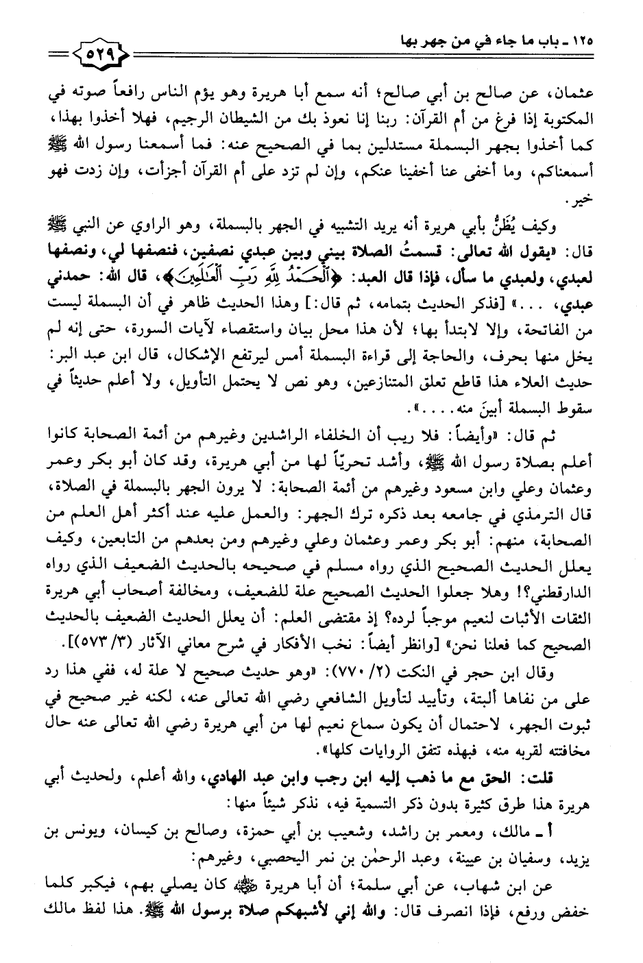 ثم قال: "وأيضًا: فلا ريب أن الخلفاء الراشدين وغيرهم من أئمة الصحابة كانوا أعلم بصلاة رسول الله - صلى الله عليه وسلم -، وأشد تحريًّا لها من أبي هريرة، وقد كان أبو بكر وعمر وعثمان وعلي وابن مسعود وغيرهم من أئمة الصحابة: لا يرون الجهر بالبسملة في الصلاة، قال الترمذي في جامعه بعد ذكره ترك الجهر: والعمل عليه عند أكثر أهل العلم من الصحابة، منهم: أبو بكر وعمر وعثمان وعلي وغيرهم ومن بعدهم من التابعين، وكيف يعلل الحديث الصحيح الذي رواه مسلم في صحيحه بالحديث الضعيف الذي رواه الدارقطني؟! وهلا جعلوا الحديث الصحيح علة للضعيف، ومخالفة أصحاب أبي هريرة الثقات الأثبات لنعيم موجبًا لرده؟ إذ مقتضى العلم: أن يعلل الحديث الضعيف بالحديث الصحيح كما فعلنا نحن" [وانظر أيضًا: نخب الأفكار في شرح معاني الآثار (٣/ ٥٧٣)].