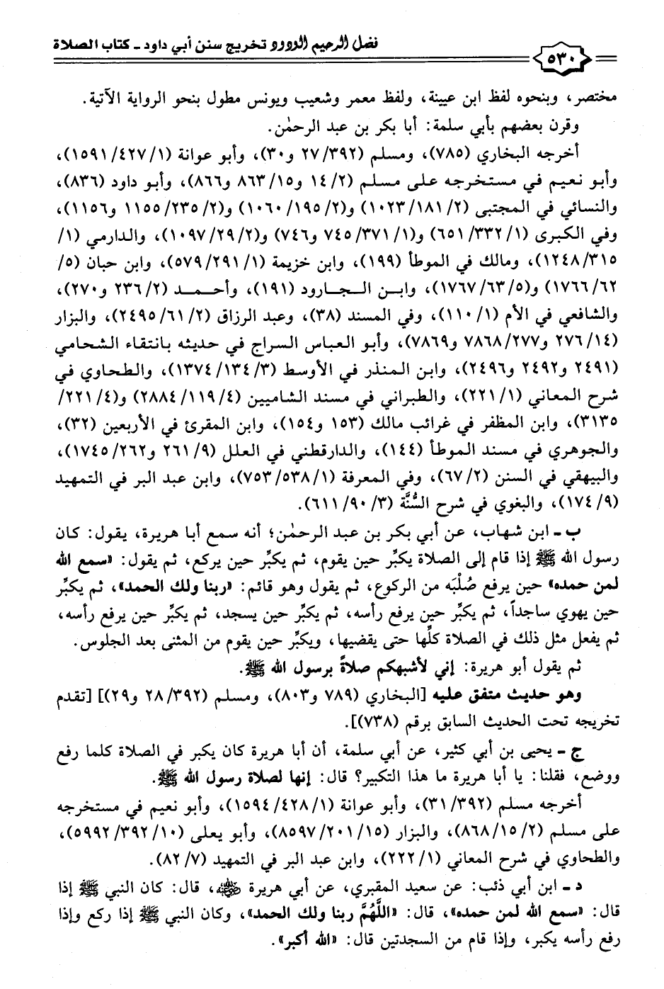 د- ابن أبي ذئب: عن سعيد المقبري، عن أبي هريرة - رضي الله عنه - قال: كان النبي - صلى الله عليه وسلم - إذا قال: "سمع الله لمن حمده"، قال: "اللَّهُمَّ ربنا ولك الحمد"، وكان النبي - صلى الله عليه وسلم - إذا ركع وإذا رفع رأسه يكبر، وإذا قام من السجدتين قال: "الله أكبر".
