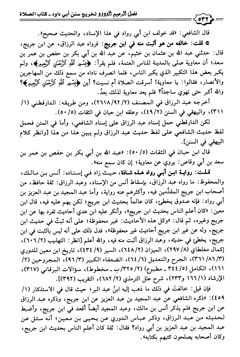 • قلت: خالفه من هو أثبت منه في ابن جريج: فرواه عبد الرزاق، عن ابن جريج، قال: حدثني عبد الله بن عثمان بن خثيم، عن عبد الله بن أبي بكر بن حفص بن عمر بن سعد؛ أن معاوية صلى بالمدينة للناس العتمة، فلم يقرأ: {بِسْمِ اللَّهِ الرَّحْمَنِ الرَّحِيمِ}، ولم يكبر بعض هذا التكبير الذي يكبر الناس، فلما انصرف ناداه من سمع ذلك من المهاجرين والأنصار، فقالوا: يا معاوية! أسرقت الصلاة أم نسيت؟ أين {بِسْمِ اللَّهِ الرَّحْمَنِ الرَّحِيمِ}؟ والله أكبر حتى تهوي ساجدًا؟ فلم يعد معاوية لذلك بعدُ.