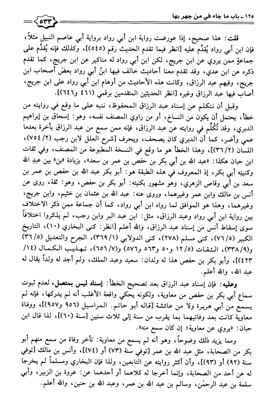 وقبل أن نتكلم عن إسناد عبد الرزاق المحفوظ، ننبه على ما وقع في روايته من خطأ، يحتمل أن يكون من النساخ، أو من راوي المصنف نفسه، وهو: إسحاق بن إبراهيم الدبري، وقد تُكُلِّم في روايته عن عبد الرزاق، فإنه ممن سمع من عبد الرزاق بأخرة بعدما عمي وأضر، كما أن الدبري كان يصحف، ويحرف [شرح العلل لابن رجب (٢/ ٧٥٤)، اللسان (٢/ ٣٦)]، وهذا الخطأ هو ما وقع في النسخة المطبوعة من المصنف، وفي ثقات ابن حبان هكذا: "عبد الله بن أبي بكر بن حفص بن عمر بن سعد"، بزيادة "بن" بين عبدِ الله وكنيتِه أبي بكر، إذ المعروف في هذه الطبقة هو: أبو بكر عبد الله بن حفص بن عمر بن سعد بن أبي وقاص الزهري، وهو مشهور بكنيته: أبو بكر بن حفص، وهو: ثقة، روى عن أنس بن مالك وابن عمر وغيرهما، وروى عنه: عبد الله بن عثمان بن خثيم، وابن جريج، وغيرهما، وهذا هو الموافق لما رواه ابن أبي رواد، كما أن جماعة ممن ذكر الاختلاف بين رواية ابن أبي رواد وعبد الرزاق، مثل: ابن عبد البر وابن رجب، لم يذكروا اختلافًا سوى إسقاط أنس من إسناد عبد الرزاق، والله أعلم [انظر: كنى البخاري (١٠)، التاريخ الكبير (٥/ ٧٦)، كنى مسلم (٢٧٨)، كنى الدولابي (١/ ٣٦٩)، الجرح والتعديل (٥/ ٣٦) و (٩/ ٣٣٨)، الثقات (٥/ ١٢ و ٥٠ و ٥٦٣ و ٥٧٦) و (٧/ ٦٥٦)، تهذيب الكمال (١٤/ ٤٢٣)]، وأبو بكر بن حفص هذا له ولدان: سعيد وعبد الملك، ولم أجد له ولدًا يقال له عبد الله، والله أعلم.