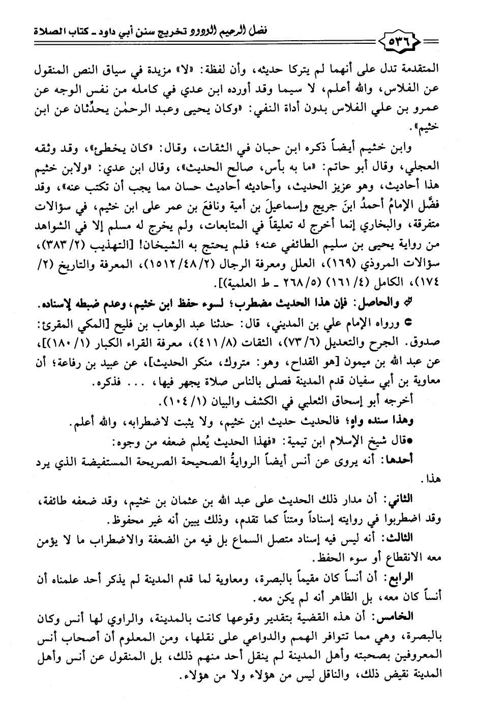 المتقدمة تدل على أنهما لم يتركا حديثه، وأن لفظة: "لا" مزيدة في سياق النص المنقول عن الفلاس، والله أعلم، لا سيما وقد أورده ابن عدي في كامله من نفس الوجه عن عمرو بن علي الفلاس بدون أداة النفي: "وكان يحيى وعبد الرحمن يحدِّثان عن ابن خثيم".