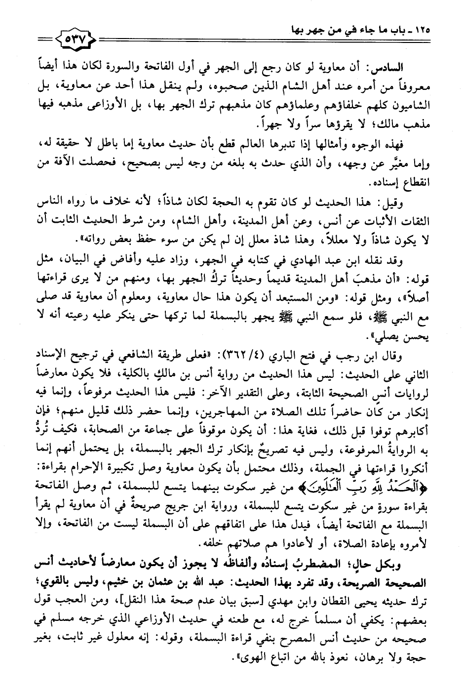 وقال ابن رجب في فتح الباري (٤/ ٣٦٢): "فعلى طريقة الشافعي في ترجيح الإسناد الثاني على الحديث: ليس هذا الحديث من رواية أنس بن مالكٍ بالكلية، فلا يكون معارضًا لروايات أنسٍ الصحيحة الثابتة، وعلى التقدير الآخر: فليس هذا الحديث مرفوعًا، وإنما فيه إنكار من كان حاضرًا تلك الصلاة من المهاجرين، وإنما حضر ذلك قليل منهم؛ فإن أكابرهم توفوا قبل ذلك، فغاية هذا: أن يكون موقوفًا على جماعة من الصحابة، فكيف تُردُّ به الروايةُ المرفوعة، وليس فيه تصريحٌ بإنكار ترك الجهر بالبسملة، بل يحتمل أنهم إنما أنكروا قراءتها في الجملة، وذلك محتمل بأن يكون معاوية وصل تكبيرة الإحرام بقراءة: {الْحَمْدُ لِلَّهِ رَبِّ الْعَالَمِينَ} من غير سكوت بينهما يتسع للبسملة، ثم وصل الفاتحة بقراءة سورةٍ من غير سكوت يتسع للبسملة، ورواية ابن جريج صريحةٌ في أن معاوية لم يقرأ البسملة مع الفاتحة أيضًا، فيدل هذا على اتفاقهم على أن البسملة ليست من الفاتحة، وإلا لأمروه بإعادة الصلاة، أو لأعادوا هم صلاتهم خلفه.