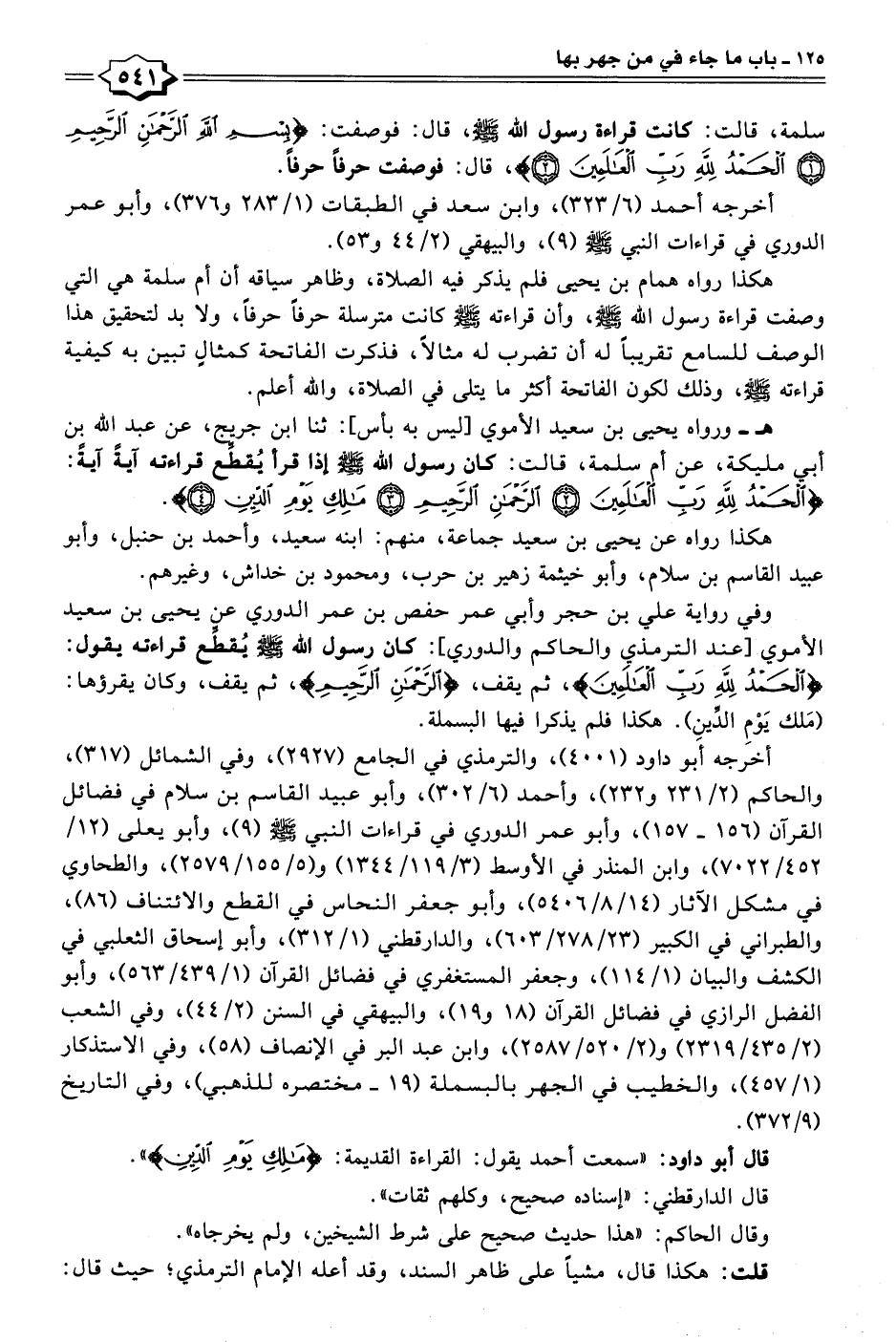 أخرجه أَبو داود (٤٠٠١)، والترمذي في الجامع (٢٩٢٧)، وفي الشمائل (٣١٧)، والحاكم (٢/ ٢٣١ و ٢٣٢)، وأحمد (٦/ ٣٠٢)، وأبو عبيد القاسم بن سلام في فضائل القرآن (١٥٦ - ١٥٧)، وأبو عمر الدوري في قراءات النبي - صلى الله عليه وسلم - (٩)، وأبو يعلى (١٢/ ٤٥٢/ ٧٠٢٢)، وابن المنذر في الأوسط (٣/ ١١٩/ ١٣٤٤) و (٥/ ١٥٥/ ٢٥٧٩)، والطحاوي في مشكل الآثار (١٤/ ٨/ ٥٤٠٦)، وأبو جعفر النحاس في القطع والائتناف (٨٦)، والطبراني في الكبير (٢٣/ ٢٧٨/ ٦٠٣)، والدارقطني (١/ ٣١٢)، وأبو إسحاق الثعلبي في الكشف والبيان (١/ ١١٤)، وجعفر المستغفري في فضائل القرآن (١/ ٤٣٩/ ٥٦٣)، وأبو الفضل الرازي في فضائل القرآن (١٨ و ١٩)، والبيهقي في السنن (٢/ ٤٤)، وفي الشعب (٢/ ٤٣٥/ ٢٣١٩) و (٢/ ٥٢٠/ ٢٥٨٧)، وابن عبد البر في الإنصاف (٥٨)، وفي الاستذكار (١/ ٤٥٧)، والخطيب في الجهر بالبسملة (١٩ - مختصره للذهبي)، وفي التاريخ (٩/ ٣٧٢).