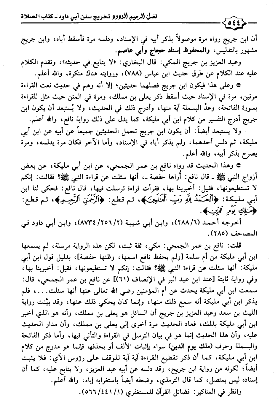 قلت: نافع بن عمر الجمحي: مكي، ثقة ثبت، لكن هذه الرواية مرسلة، لم يسمعها ابن أبي مليكة من أم سلمة [ولم يحفظ نافع اسمها، وظنها حفصة]، بدليل قول ابن أبي مليكة: أنها سئلت عن قراءة النبي - صلى الله عليه وسلم -؟ فقالت: إنكم لا تستطيعونها، فقيل: أخبرينا بها، وفي رواية ثابتة [عند ابن عبد البر في الإنصاف (٦١)] عن نافع بن عمر الجمحي، قال: سمعت ابن أبي مليكة يحدث عن أم المؤمنين رضي الله تعالى عنها أنها سئلت ... ، فلم يذكر ابن أبي مليكة أنه سمع ذلك منها، وإنما كان يحكي ذلك عنها، وقد بيَّنت رواية الليث بن سعد وعبد العزيز بن جريج أن السائل هو يعلى بن مملك، وأنه هو الذي أخبر ابن أبي مليكة بذلك، فعاد الحديث مرة أخرى إلى يعلى بن مملك، وأن مدار الحديث عليه، وأن هذا الحديث إنما هو في بيان الترسل في القراءة والتاني فيها، وأما ذكر الفاتحة والبسملة وحرف {مَالِكِ يَوْمِ الدِّينِ} سواء بإثبات الألف أو بحذفها فإنما هو مدرج من كلام ابن أبي مليكة، كما أن ذكر تقطيع القراءة آية آية للوقف على رؤوس الآي: فلا يثبت أيضًا؛ لكونه من رواية ابن جريج، وقد دلسه عن أبيه عبد العزيز، ولا يتابع عليه، كما أن إسناده ليس بمتصل، كما قال الترمذي، وضعفه أيضًا باستغرابه إياه، والله أعلم.