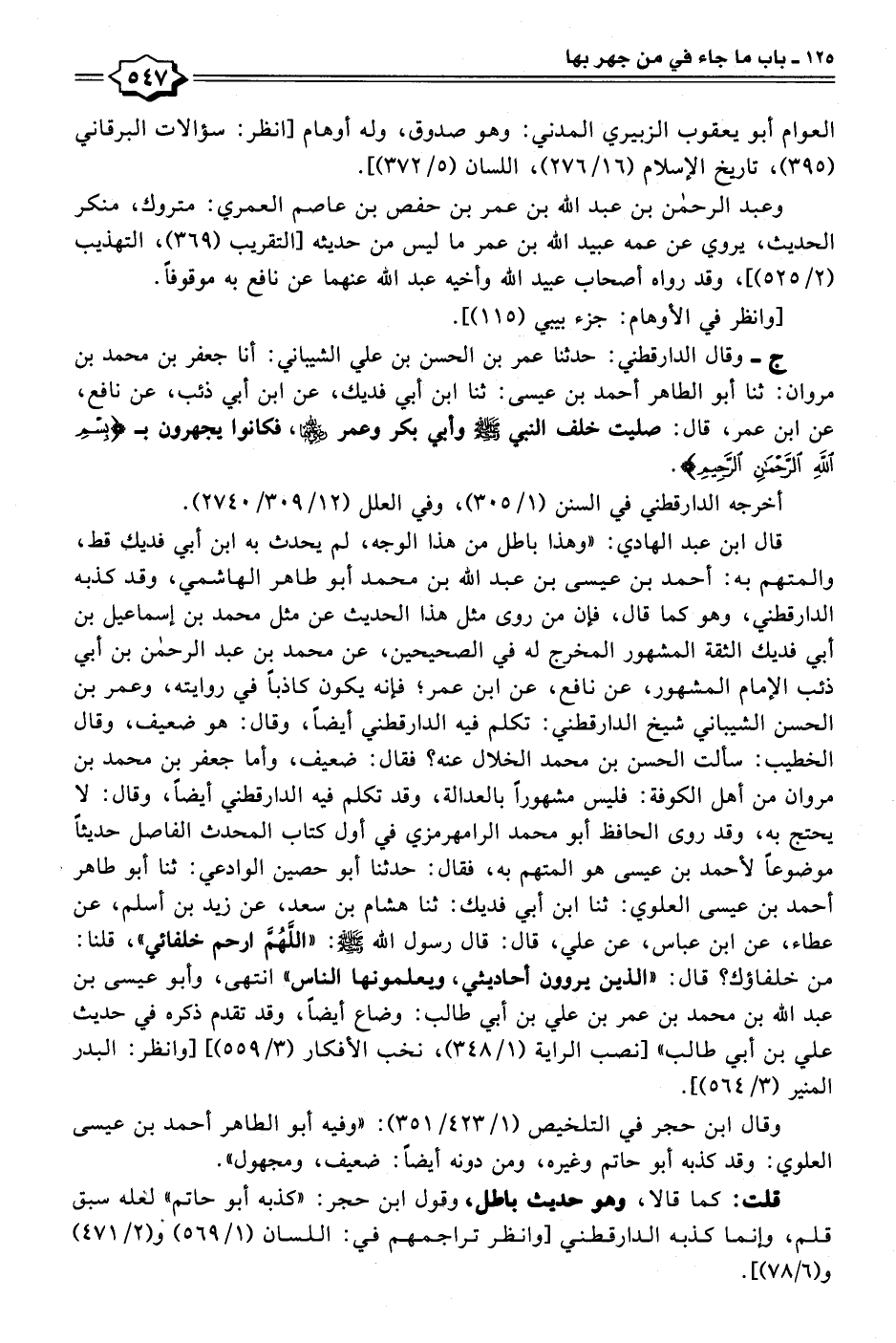 ج- وقال الدارقطني: حدثنا عمر بن الحسن بن علي الشيباني: أنا جعفر بن محمد بن مروان: ثنا أبو الطاهر أحمد بن عيسى: ثنا ابن أبي فديك، عن ابن أبي ذئب، عن نافع، عن ابن عمر، قال: صليت خلف النبي - صلى الله عليه وسلم - وأبي بكر وعمر - رضي الله عنهما -، فكانوا يجهرون بـ {بِسْمِ اللَّهِ الرَّحْمَنِ الرَّحِيمِ}.