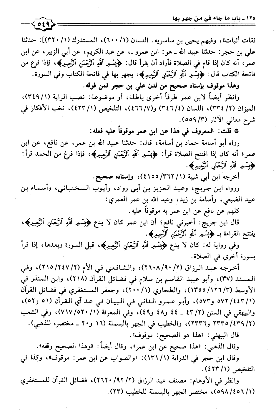 ثقات أثبات"، وفيهم يحيى بن ساسويه. اللسان (١/ ٦٠٠)، المستدرك (١/ ٣٢٠)]: حدثنا علي بن حجر: حدثنا عبيد الله -هو: ابن عمرو-، عن عبد الكريم، عن أبي الزبير، عن ابن عمر، أنه كان إذا قام في الصلاة فأراد أن يقرأ قال: {بِسْمِ اللَّهِ الرَّحْمَنِ الرَّحِيمِ}، فإذا فرغ من فاتحة الكتاب قال: {بِسْمِ اللَّهِ الرَّحْمَنِ الرَّحِيمِ}، يجهر بها في فاتحة الكتاب وفي السورة.