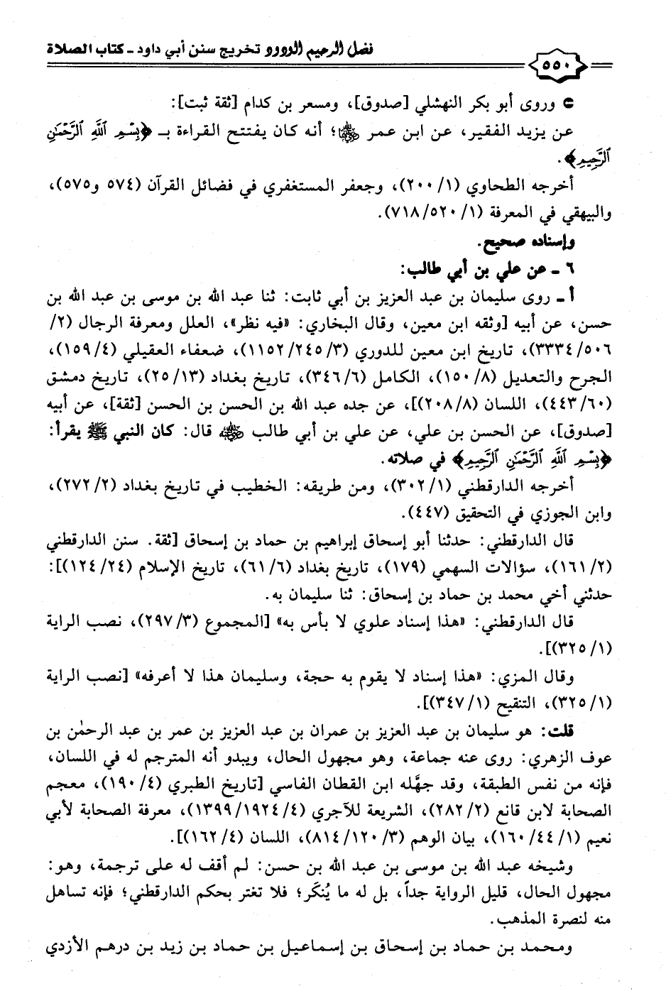 أ- روى سليمان بن عبد العزيز بن أبي ثابت: ثنا عبد الله بن موسى بن عبد الله بن حسن، عن أبيه [وثقه ابن معين، وقال البخاري: "فيه نظر"، العلل ومعرفة الرجال (٢/ ٥٠٦/ ٣٣٣٤)، تاريخ ابن معين للدوري (٣/ ٢٤٥/ ١١٥٢)، ضعفاء العقيلي (٤/ ١٥٩)، الجرح والتعديل (٨/ ١٥٠)، الكامل (٦/ ٣٤٦)، تاريخ بغداد (١٣/ ٢٥)، تاريخ دمشق (٦٠/ ٤٤٣)، اللسان (٨/ ٢٠٨)]، عن جده عبد الله بن الحسن بن الحسن [ثقة]، عن أبيه [صدوق]، عن الحسن بن علي، عن علي بن أبي طالب - رضي الله عنه - قال: كان النبي - صلى الله عليه وسلم - يقرأ: {بِسْمِ اللَّهِ الرَّحْمَنِ الرَّحِيمِ} في صلاته.
