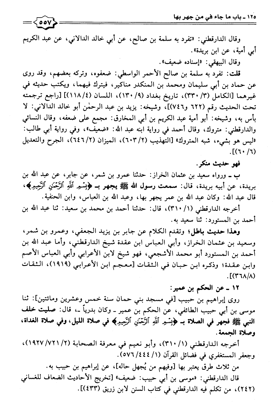 ب- ورواه سعيد بن عثمان الخراز: حدثنا عمرو بن شمر، عن جابر، عن عبد الله بن بريدة، عن أبيه بريدة، قال: سمعت رسول الله - صلى الله عليه وسلم - يجهر بـ {بِسْمِ اللَّهِ الرَّحْمَنِ الرَّحِيمِ}، قال عبد الله: وكان عبد الله بن عمر يجهر بها، وعبد الله بن العباس، وابن الحنفية.