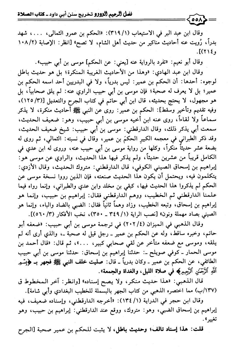 وقال ابن عبد الهادي: "وهذا من الأحاديث الغريبة المنكرة؛ بل هو حديث باطل لوجوه: أحدها: أن الحكم بن عمير: ليس بدريًّا، ولا في البدريين أحد اسمه الحكم بن عمير؛ بل لا يعرف له صحبة؛ فإن موسى بن أبي حبيب الراوي عنه: لم يلق صحابيًّا، بل هو مجهول، لا يحتج بحديثه، قال ابن أبي حاتم في كتاب الجرح والتعديل [(٣/ ١٢٥)، وفيه تقديم وتأخير وسقط]: الحكم بن عمير: روى عن النبي - صلى الله عليه وسلم - أحاديث منكرة، لا يذكر سماعًا ولا لقاءًا، روى عنه ابن أخيه موسى بن أبي حبيب، وهو: ضعيف الحديث، سمعت أبي يذكر ذلك، وقال الدارقطني: موسى بن أبي حبيب: شيخ ضعيف الحديث، وقد ذكر الطبراني في معجمه الكبيرِ الحكمَ بن عمير، وقال في نسبته: الثمالي، ثم روى له بضعة عشر حديثًا منكرًا، وكلها من رواية موسى بن أبي حبيب عنه، وروى له ابن عدي في الكامل قريبًا من عشرين حديثًا، ولم يذكر فيها هذا الحديث، والراوي عن موسى هو: إبراهيم بن إسحاق الصيني الكوفي، قال الدارقطني: متروك الحديث، وقال الأزدي: يتكلمون فيه، ويحتمل أن يكون هذا الحديث صنعته، فإن الذين رووا نسخة موسى عن الحكم لم يذكروا هذا الحديث فيها، كبقي بن مخلد وابن عدي والطبراني، وإنما رواه فيما علمنا الدارقطني ثم الخطيب، ووهم الدارقطني فقال: إبراهيم بن حبيب، وإنما هو إبراهيم بن إسحاق، وتبعه الخطيب، وزاد وهمًا ثانيًا فقال: الضبي بالضاد والباء، وإنما هو الصيني بصاد مهملة ونون" [نصب الراية (١/ ٣٤٩ - ٣٥٠)، نخب الأفكار (٣/ ٥٦٠)].