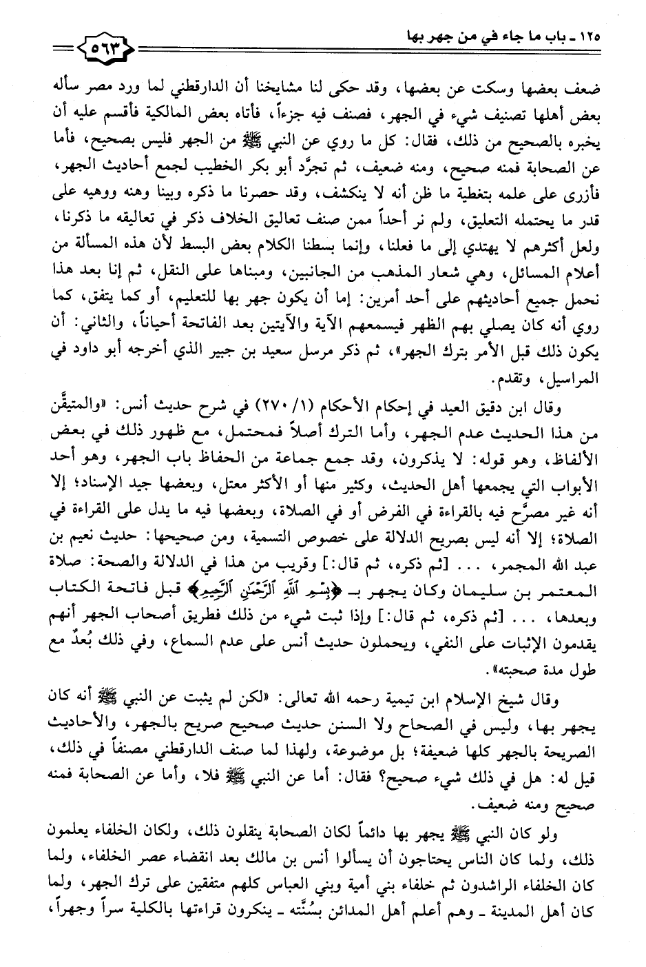 وقال شيخ الإسلام ابن تيمية رحمه الله تعالى: "لكن لم يثبت عن النبي - صلى الله عليه وسلم - أنه كان يجهر بها، وليس في الصحاح ولا السنن حديث صحيح صريح بالجهر، والأحاديث الصريحة بالجهر كلها ضعيفة؛ بل موضوعة، ولهذا لما صنف الدارقطني مصنفًا في ذلك، قيل له: هل في ذلك شيء صحيح؟ فقال: أما عن النبي - صلى الله عليه وسلم - فلا، وأما عن الصحابة فمنه صحيح ومنه ضعيف.