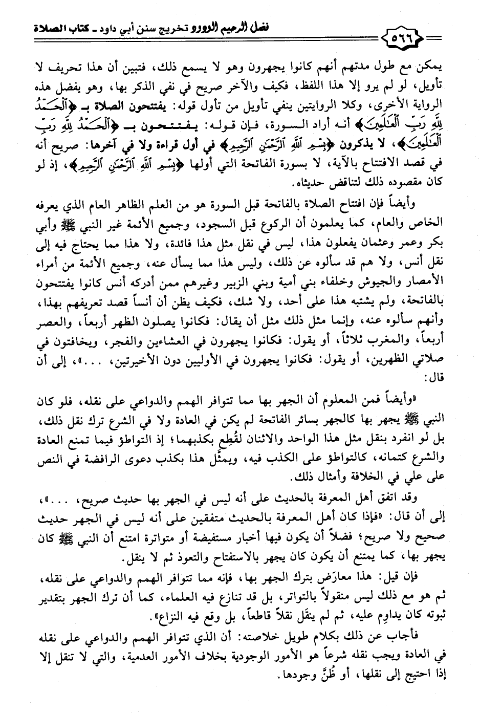 "وأيضًا فمن المعلوم أن الجهر بها مما تتوافر الهمم والدواعي على نقله، فلو كان النبي - صلى الله عليه وسلم - يجهر بها كالجهر بسائر الفاتحة لم يكن في العادة ولا في الشرع ترك نقل ذلك، بل لو انفرد بنقل مثل هذا الواحد والاثنان لقُطِع بكذبهما؛ إذ التواطؤ فيما تمنع العادة والشرع كتمانه، كالتواطؤ على الكذب فيه، ويمثَّل هذا بكذب دعوى الرافضة في النص على علي في الخلافة وأمثال ذلك.