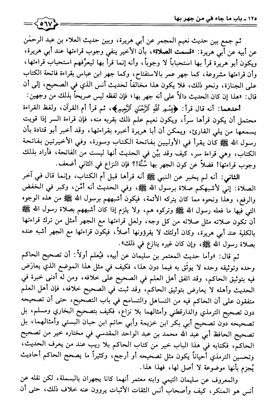 ثم جمع بين حديث نعيم المجمر عن أبي هريرة، وبين حديث العلاء بن عبد الرحمن عن أبيه عن أبي هريرة: "قسمت الصلاة"، بأن الأخير ينفي وجوب قراءتها عند أبي هريرة، ويكون أبو هريرة قرأ بها استحبابًا لا وجوبًا، وأنه إنما قرأ بها ليعرِّفهم استحباب قراءتها، وأن قراءتها مشروعة، كما جهر عمر بالاستفتاح، وكما جهر ابن عباس بقراءة فاتحة الكتاب على الجنازة، ونحو ذلك، فلا يكون هذا مخالفًا لحديث أنس الذي في الصحيح، إلى أن قال: "هذا إن كان الحديث دالًا على أنه جهر بها؛ فإن لفظه ليس صريحًا بذلك من وجهين: