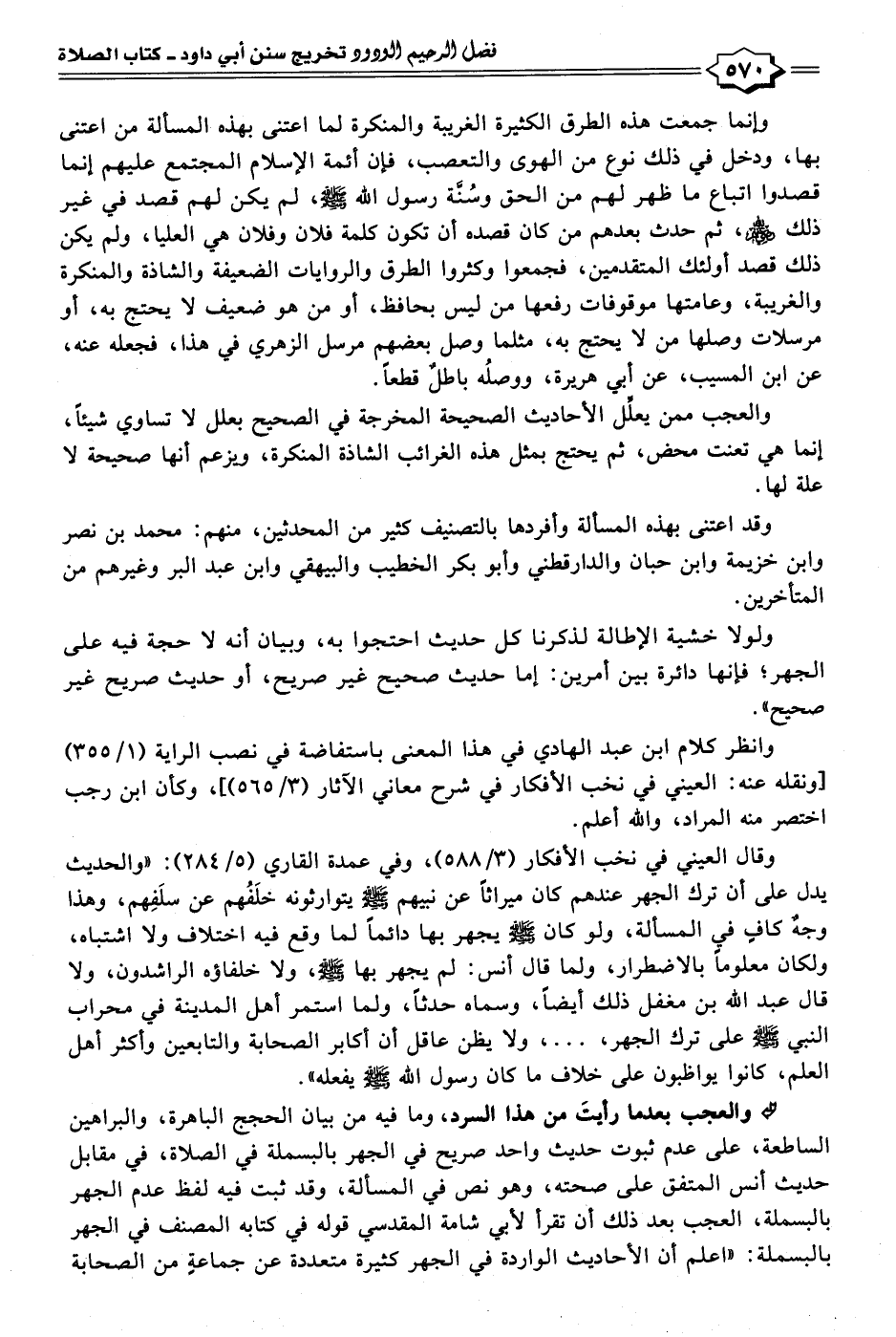 • والعجب بعدما رأيتَ من هذا السرد، وما فيه من بيان الحجج الباهرة، والبراهين الساطعة، على عدم ثبوت حديث واحد صريح في الجهر بالبسملة في الصلاة، في مقابل حديث أنس المتفق على صحته، وهو نص في المسألة، وقد ثبت فيه لفظ عدم الجهر بالبسملة، العجب بعد ذلك أن تقرأ لأبي شامة المقدسي قوله في كتابه المصنف في الجهر بالبسملة: "اعلم أن الأحاديث الواردة في الجهر كثيرة متعددة عن جماعةٍ من الصحابة