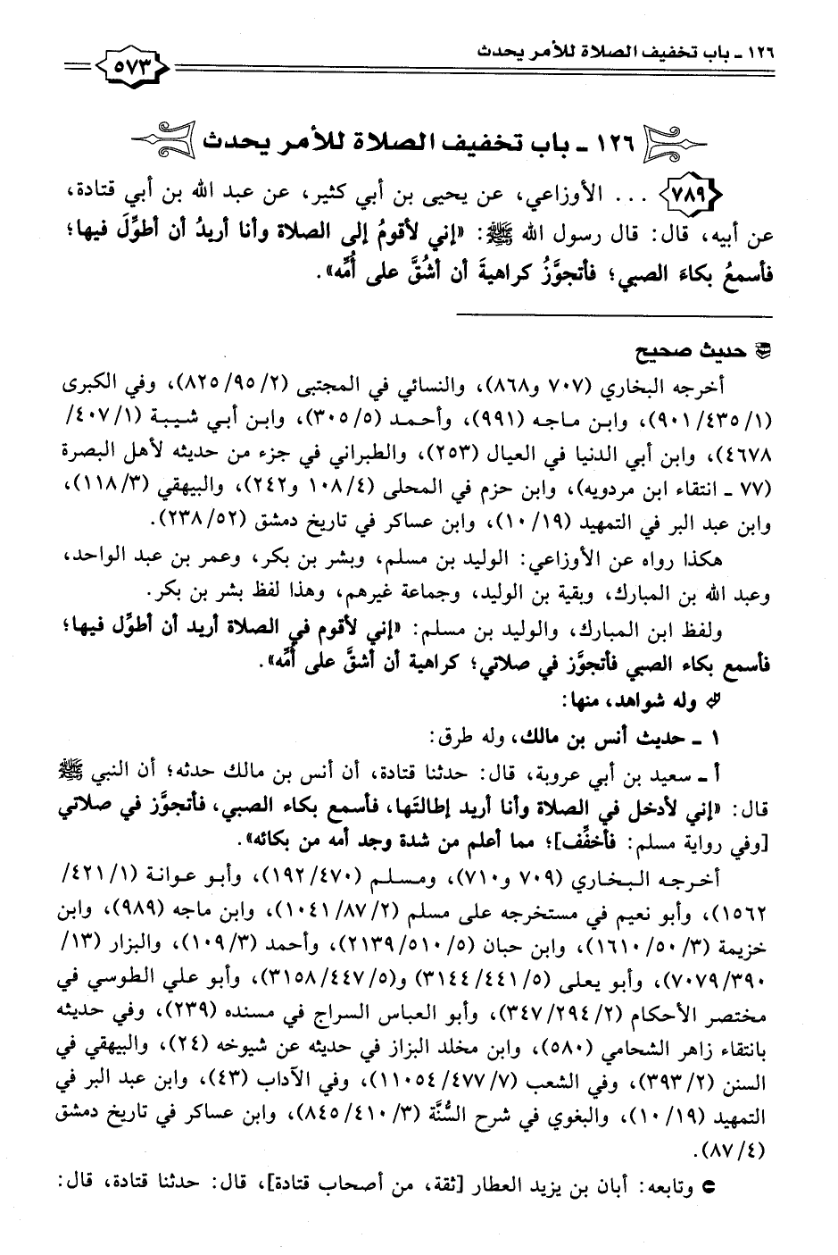 ولفظ ابن المبارك، والوليد بن مسلم: "إني لأقوم في الصلاة أريد أن أطوِّل فيها؛ فأسمع بكاء الصبي فأتجوَّز في صلاتي؛ كراهية أن أشقَّ على أمِّه".