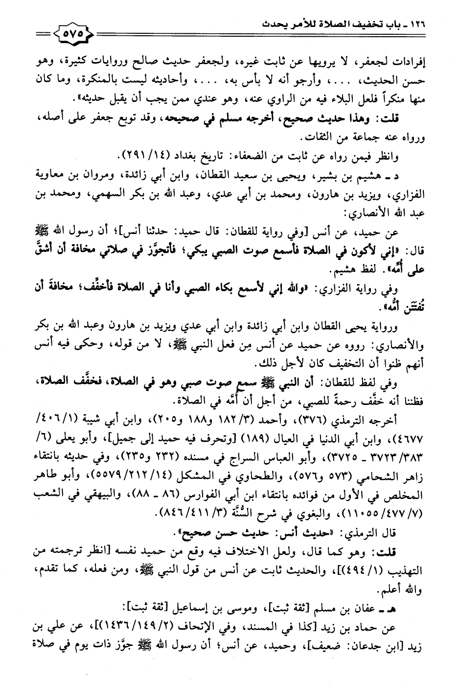 عن حميد، عن أنس [وفي رواية للقطان: قال حميد: حدثنا أنس]؛ أن رسول الله - صلى الله عليه وسلم - قال: "إني لأكون في الصلاة فأسمع صوت الصبي يبكي؛ فأتجوَّز في صلاتي مخافة أن أشقَّ على أُمِّه". لفظ هشيم.