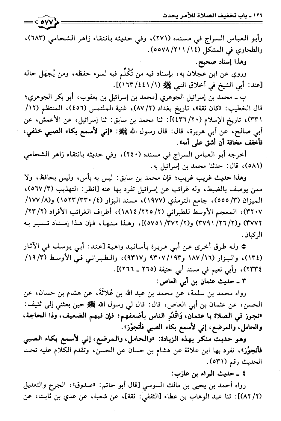 رواه محمد بن سلمة، عن محمد بن عبد الله بن عُلاثَةَ، عن هشام بن حسان، عن الحسن، عن عثمان بن أبي العاص، قال: قال لي رسول الله - صلى الله عليه وسلم - حين بعثني إلى ثقيف: "تجوز في الصلاة يا عثمان، وَاقْدُرِ الناس بأضعفهم؛ فإن فيهم الضعيف، وذا الحاجة، والحامل، والمرضع، إني لأسمع بكاء الصبي فأتجوَّز".