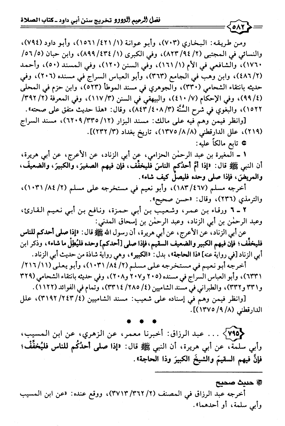 عن أبي الزناد، عن الأعرج، عن أبي هريرة، أن رسول الله - صلى الله عليه وسلم - قال: "إذا صلى أحدكم للناس فليخفِّف؛ فإن فيهم الكبير والضعيف السقيم، فإذا صلى [أحدكم] وحده فليُطِلْ ما شاء"، وذكر ابن أبي الزناد [في رواية عنه] "ذا الحاجة"، بدل: "الكبير"، وهي رواية شاذة من حديث أبي الزناد.