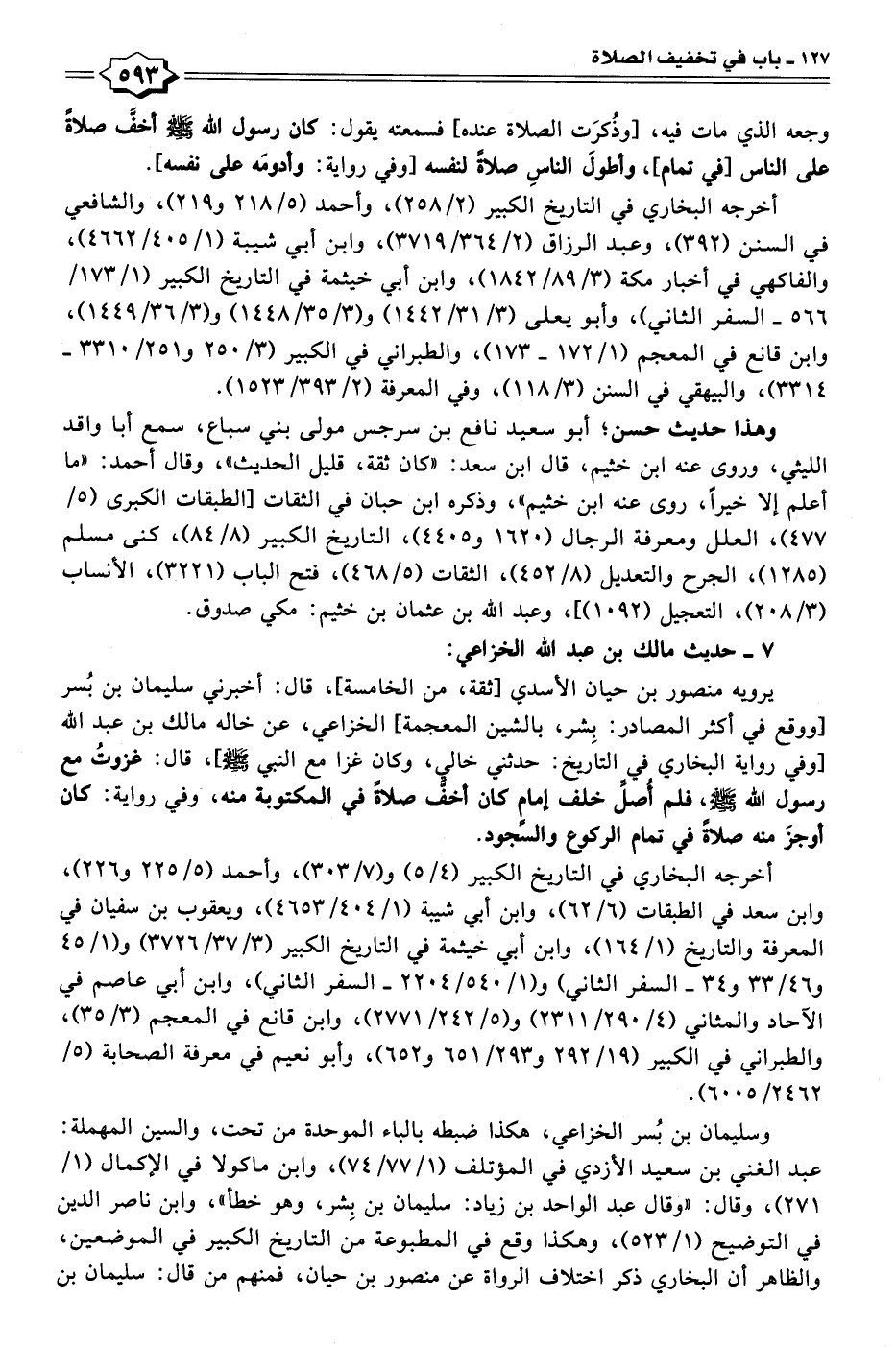 يرويه منصور بن حيان الأسدي [ثقة، من الخامسة]، قال: أخبرني سليمان بن بُسر [ووقع في أكثر المصادر: بِشر، بالشين المعجمة] الخزاعي، عن خاله مالك بن عبد الله [وفي رواية البخاري في التاريخ: حدثني خالي، وكان غزا مع النبي - صلى الله عليه وسلم -]، قال: غزوتُ مع رسول الله - صلى الله عليه وسلم -، فلم أُصلِّ خلف إمامٍ كان أخفَّ صلاةً في المكتوبة منه، وفي رواية: كان أوجزَ منه صلاةً في تمام الركوع والسجود.