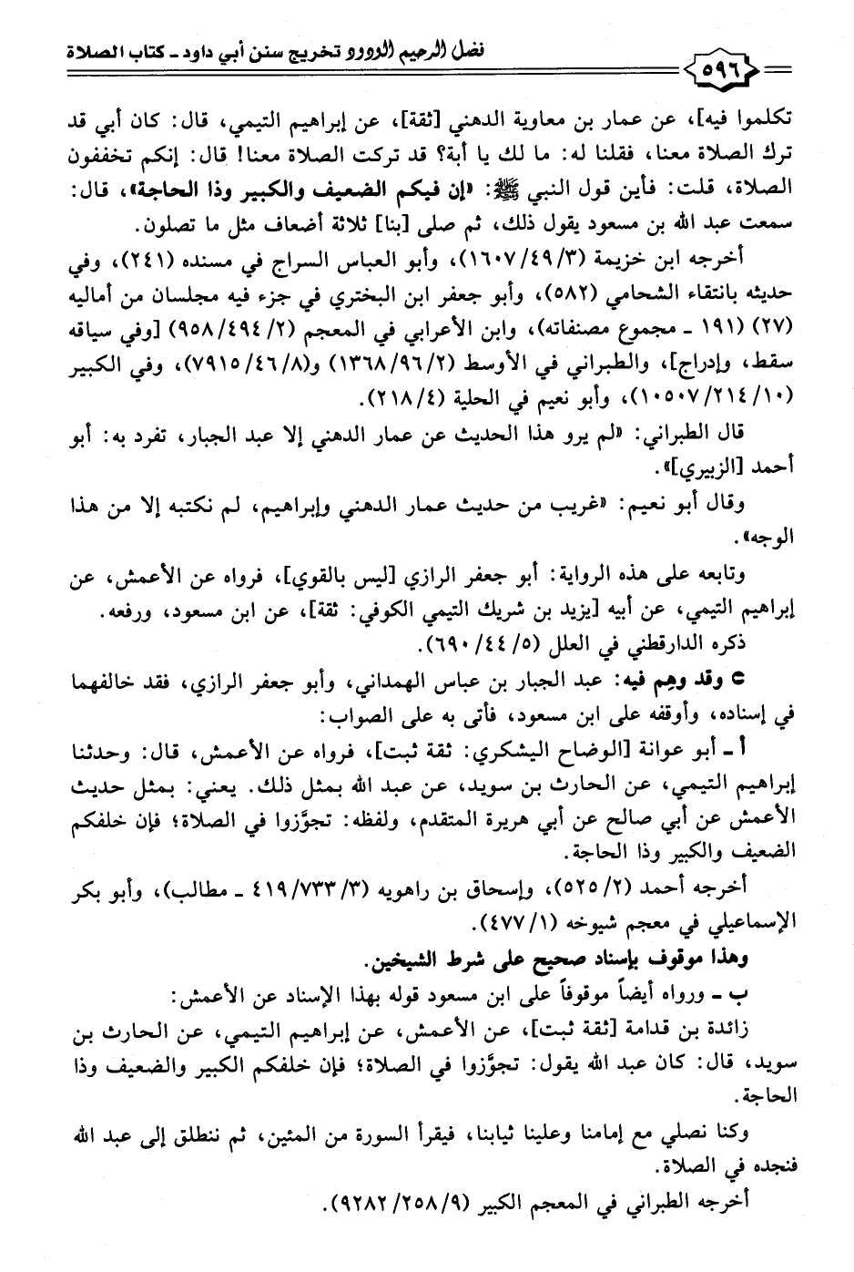 زائدة بن قدامة [ثقة ثبت]، عن الأعمش، عن إبراهيم التيمي، عن الحارث بن سويد، قال: كان عبد الله يقول: تجوَّزوا في الصلاة؛ فإن خلفكم الكبير والضعيف وذا الحاجة.