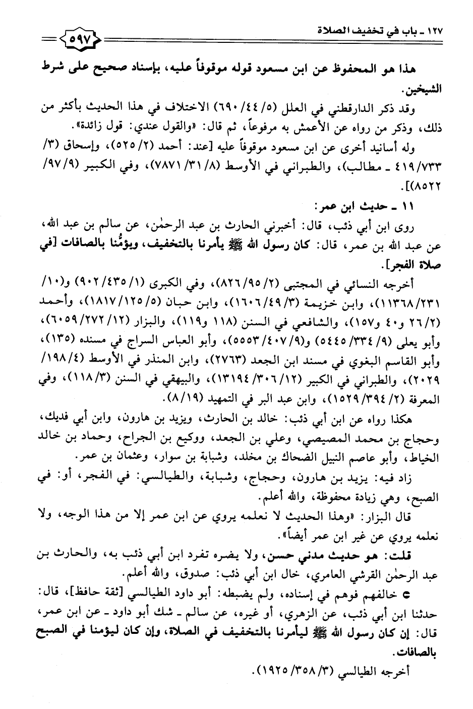 روى ابن أبي ذئب، قال: أخبرني الحارث بن عبد الرحمن، عن سالم بن عبد الله، عن عبد الله بن عمر، قال: كان رسول الله - صلى الله عليه وسلم - يأمرنا بالتخفيف، ويؤمُّنا بالصافات [في صلاة الفجر].