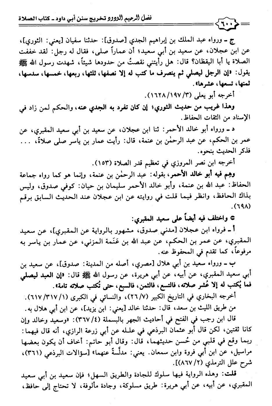 ج- ورواه عبد الملك بن إبراهيم الجدي [صدوق]: حدثنا سفيان [يعني: الثوري]، عن ابن عجلان، عن سعيد بن أبي سعيد؛ أن عمارًا صلى، فقال له رجل: لقد خففت الصلاة يا أبا اليقظان؟ قال: هل رأيتني نقصتُ من حدودها شيئًا، شهدت رسول الله - صلى الله عليه وسلم - يقول: "إن الرجل ليصلي ثم ينصرف ما كتب له إلا نصفها، ثلثها، ربعها، خمسها، سدسها، ثمنها، تسعها، عشرها".