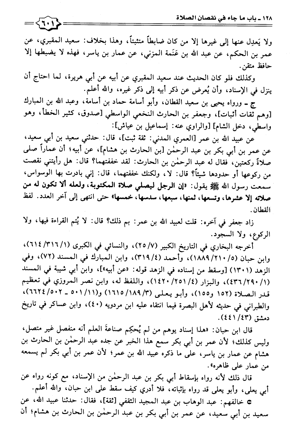 عن عبيد الله بن عمر [العمري المدني: ثقة ثبت]، قال: حدثني سعيد بن أبي سعيد، عن عمر بن أبي بكر بن عبد الرحمن [بن الحارث بن هشام]، عن أبيه؛ أن عمارًا صلى صلاةً ركعتين، فقال له عبد الرحمن بن الحارث: لقد خففتهما؟ قال: هل رأيتني نقصت من ركوعها أو حدودها شيئًا؟ قال: لا، ولكنك خففتهما، قال: إني بادرت بها الوسواس، سمعت رسول الله - صلى الله عليه وسلم - يقول: "إن الرجل ليصلي صلاة المكتوبة، ولعله ألا تكون له من صلاته إلا عشرها، وتسعها، ثمنها، سبعها، سدسها، خمسها" حتى انتهى إلى آخر العدد. لفظ القطان.