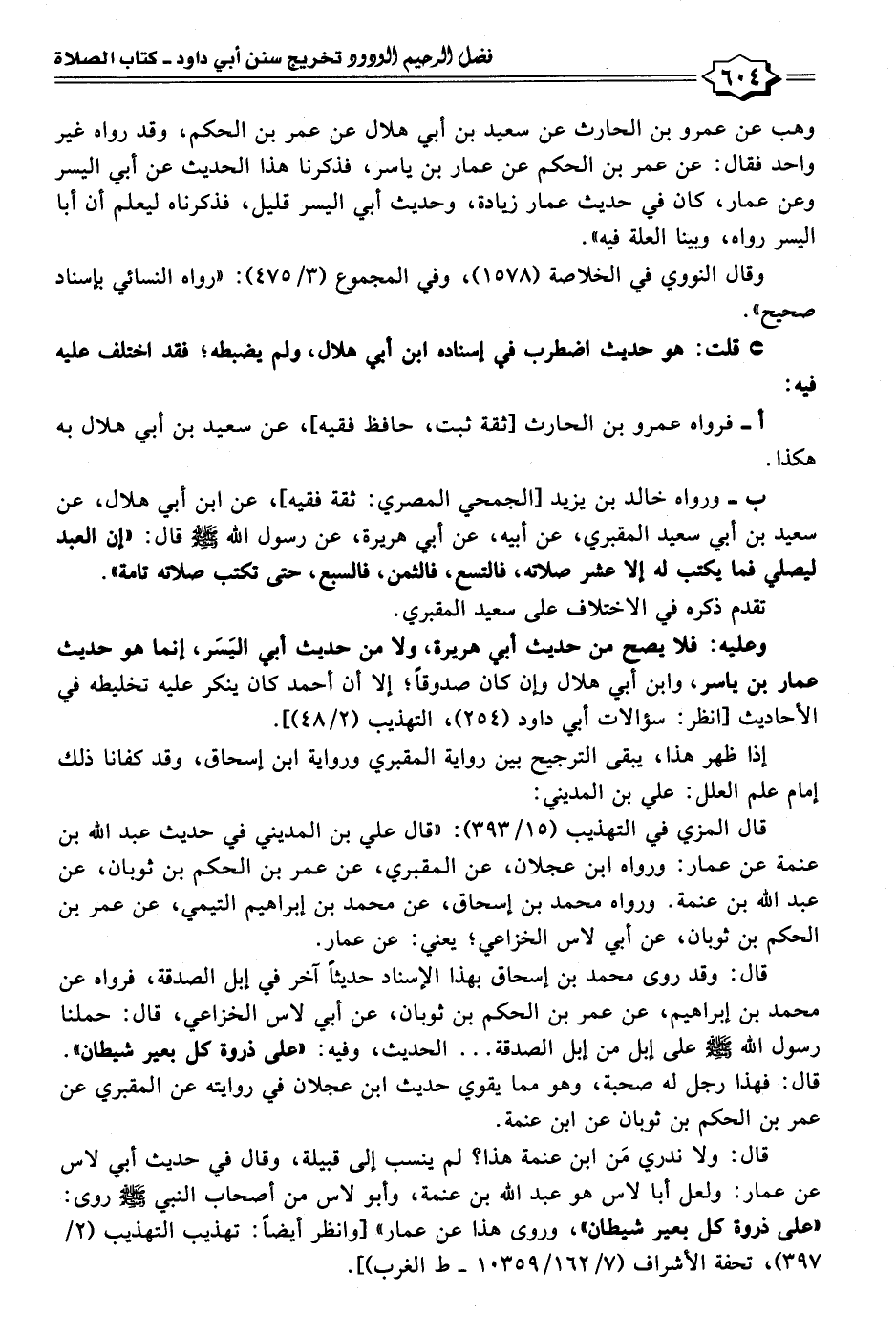 ب- ورواه خالد بن يزيد [الجمحي المصري: ثقة فقيه]، عن ابن أبي هلال، عن سعيد بن أبي سعيد المقبري، عن أبيه، عن أبي هريرة، عن رسول الله - صلى الله عليه وسلم - قال: "إن العبد ليصلي فما يكتب له إلا عشر صلاته، فالتسع، فالثمن، فالسبع، حتى تكتب صلاته تامة".