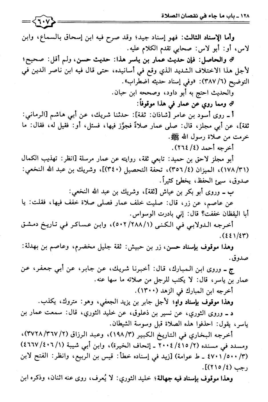 أ- روى أسود بن عامر [شاذان: ثقة]: حدثنا شريك، عن أبي هاشم الرماني: ثقة]، عن أبي مجلز، قال: صلى عمار صلاةً فجوَّز فيها، فسئل، أو: فقيل له، فقال: ما خرمت من صلاة رسول الله - صلى الله عليه وسلم -.