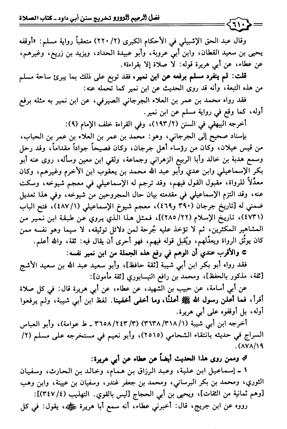 وقال عبد الحق الإشبيلي في الأحكام الكبرى (٢/ ٢٢٠) متعقبًا رواية مسلم: "أوقفه يحيى بن سعيد القطان، وابن أبي عروبة، وأبو عبيدة الحداد، ويزيد بن زريع، وغيرهم، عن عطاء، عن أبي هريرة قوله: لا صلاة إلا بقراءة".