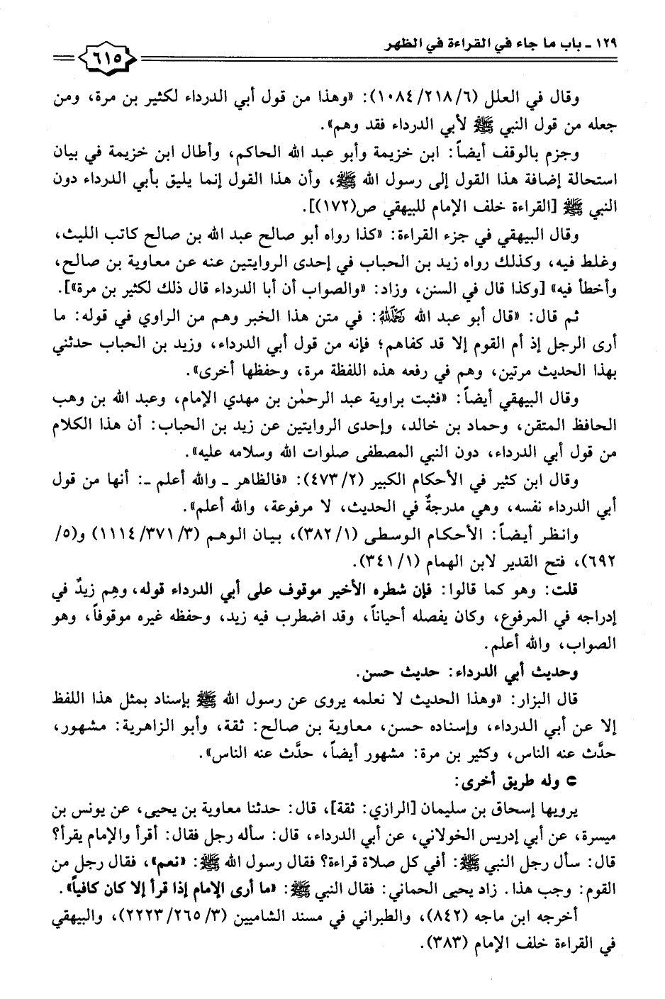 وجزم بالوقف أيضًا: ابن خزيمة وأبو عبد الله الحاكم، وأطال ابن خزيمة في بيان استحالة إضافة هذا القول إلى رسول الله - صلى الله عليه وسلم -، وأن هذا القول إنما يليق بأبي الدرداء دون النبي - صلى الله عليه وسلم -[القراءة خلف الإمام للبيهقي ص (١٧٢)].