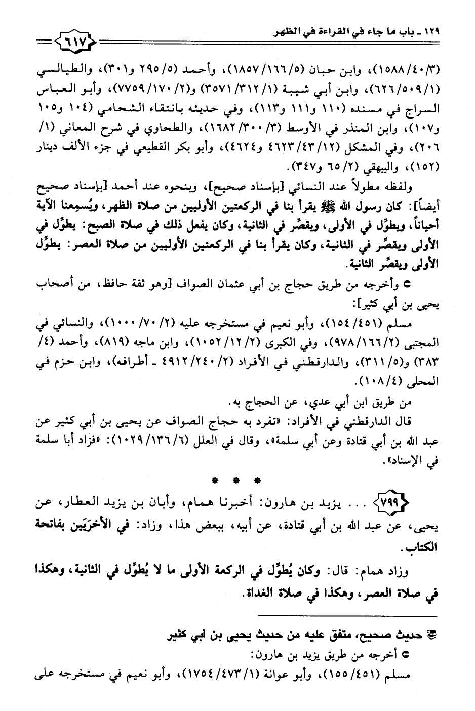 ٧٩٩ - . . . يزيد بن هارون: أخبرنا همام، وأبان بن يزيد العطار، عن يحيى، عن عبد الله بن أبي قتادة، عن أبيه، ببعض هذا، وزاد: في الأخرَيَين بفاتحة الكتاب.