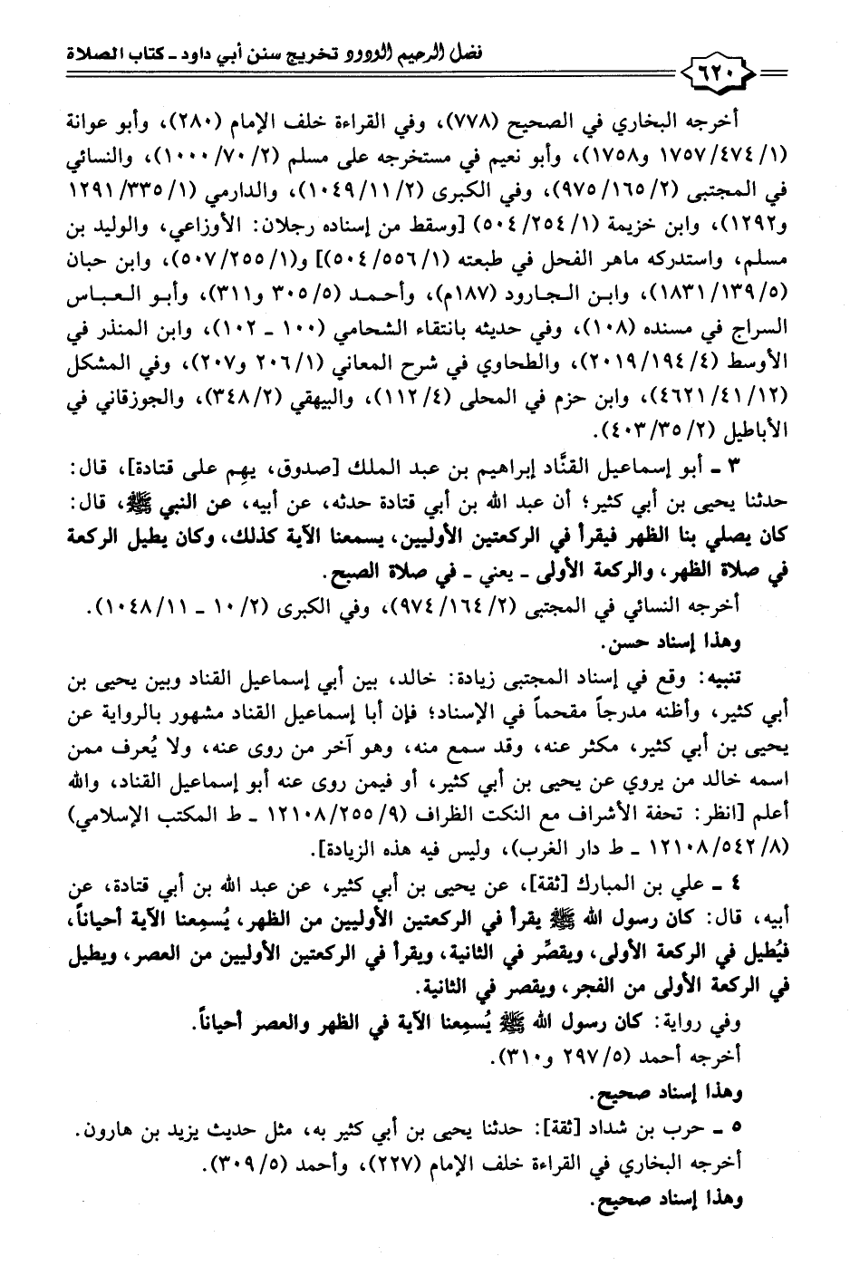 ٣ - أبو إسماعيل القنَّاد إبراهيم بن عبد الملك [صدوق، يهِم على قتادة]، قال: حدثنا يحيى بن أبي كثير؛ أن عبد الله بن أبي قتادة حدثه، عن أبيه، عن النبي - صلى الله عليه وسلم -، قال: كان يصلي بنا الظهر فيقرأ في الركعتين الأوليين، يسمعنا الآية كذلك، وكان يطيل الركعة في صلاة الظهر، والركعة الأولى -يعني- في صلاة الصبح.