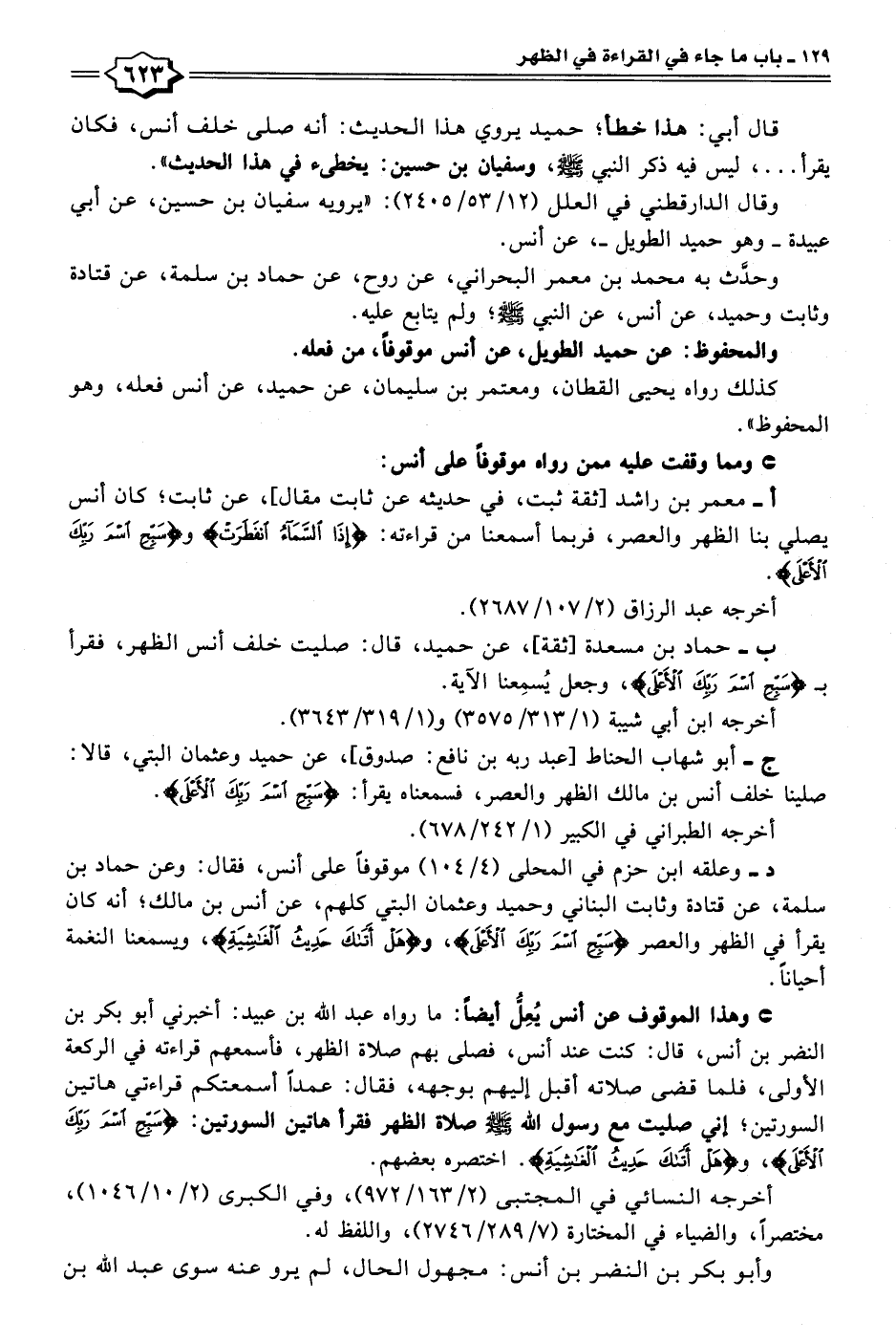 • وهذا الموقوف عن أنس يُعِلُّ أيضًا: ما رواه عبد الله بن عبيد: أخبرني أبو بكر بن النضر بن أنس، قال: كنت عند أنس، فصلى بهم صلاة الظهر، فأسمعهم قراءته في الركعة الأولى، فلما قضى صلاته أقبل إليهم بوجهه، فقال: عمدًا أسمعتكم قراءتي هاتين السورتين؛ إني صليت مع رسول الله - صلى الله عليه وسلم - صلاة الظهر فقرأ هاتين السورتين: {سَبِّحِ اسْمَ رَبِّكَ الْأَعْلَى}، و {هَلْ أَتَاكَ حَدِيثُ الْغَاشِيَةِ}. اختصره بعضهم.