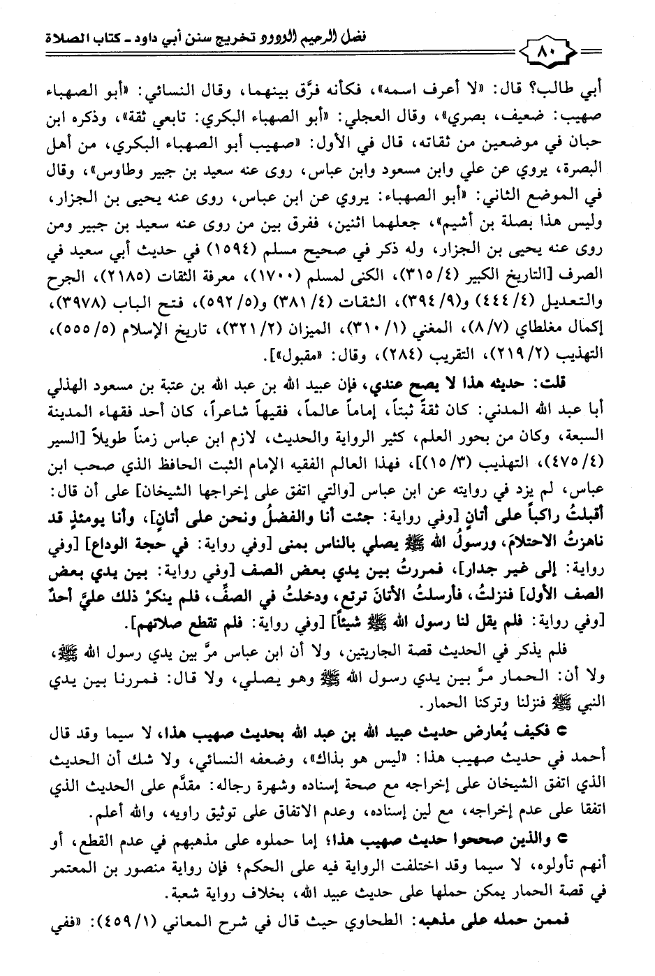 قلت: حديثه هذا لا يصح عندي، فإن عبيد الله بن عبد الله بن عتبة بن مسعود الهذلي أبا عبد الله المدني: كان ثقةً ثبتًا، إمامًا عالمًا، فقيهًا شاعرًا، كان أحد فقهاء المدينة السبعة، وكان من بحور العلم، كثير الرواية والحديث، لازم ابن عباس زمنًا طويلًا [السير (٤/ ٤٧٥)، التهذيب (٣/ ١٥)]، فهذا العالم الفقيه الإمام الثبت الحافظ الذي صحب ابن عباس، لم يزد في روايته عن ابن عباس [والتي اتفق على إخراجها الشيخان] على أن قال: أقبلتُ راكبًا على أتانٍ [وفي رواية: جئت أنا والفضلُ ونحن على أتانٍ]، وأنا يومئذٍ قد ناهزتُ الاحتلامَ، ورسولُ الله - صلى الله عليه وسلم - يصلي بالناس بمنى [وفي رواية: في حجة الوداع] [وفي رواية: إلى غير جدار]، فمررتُ بين يدي بعض الصف [وفي رواية: بين يدي بعض الصف الأول] فنزلتُ، فأرسلتُ الأتانَ ترتع، ودخلتُ في الصفِّ، فلم ينكرْ ذلك عليَّ أحدٌ [وفي رواية: فلم يقل لنا رسول الله - صلى الله عليه وسلم - شيئًا] [وفي رواية: فلم تقطع صلاتهم].