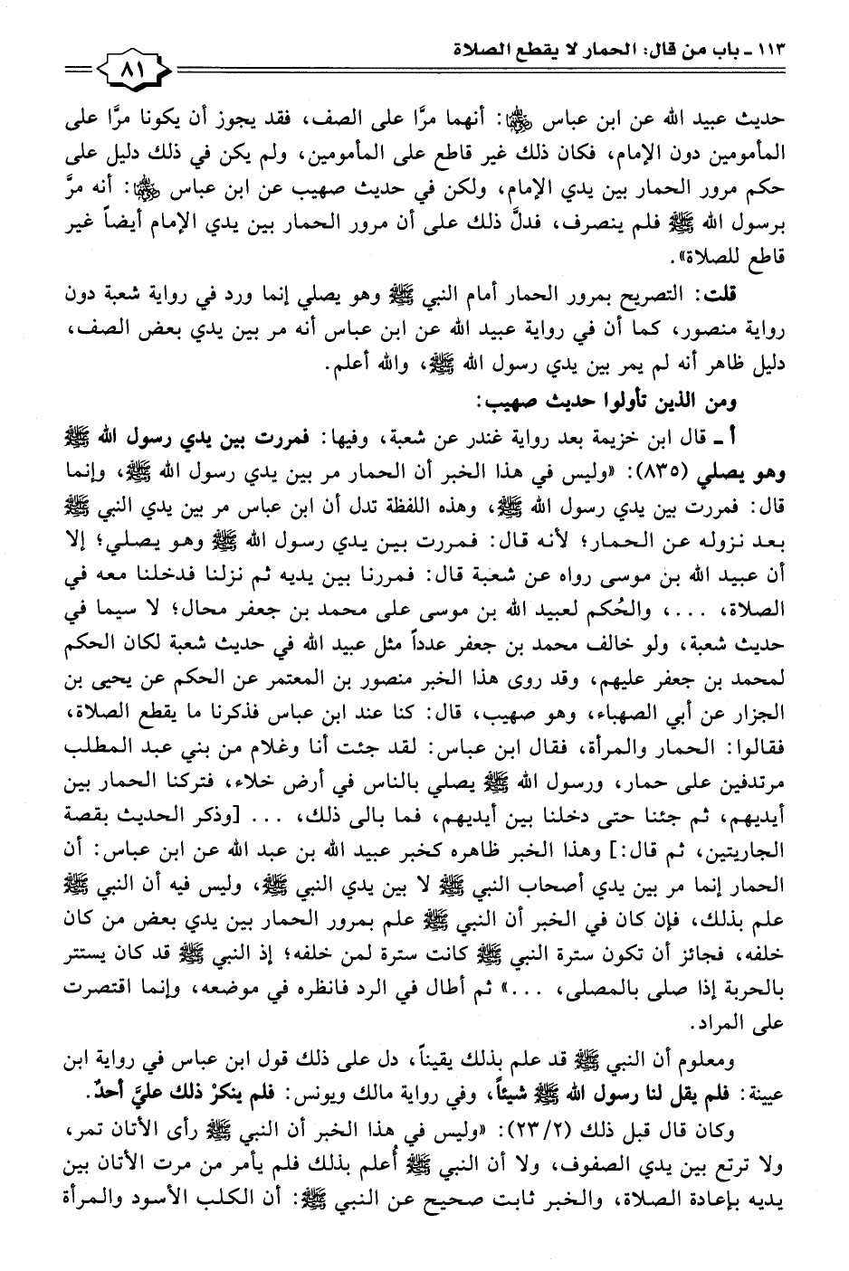 وكان قال قبل ذلك (٢/ ٢٣): "وليس في هذا الخبر أن النبي - صلى الله عليه وسلم - رأى الأتان تمر، ولا ترتع بين يدي الصفوف، ولا أن النبي - صلى الله عليه وسلم - أُعلم بذلك فلم يأمر من مرت الأتان بين يديه بإعادة الصلاة، والخبر ثابت صحيح عن النبي - صلى الله عليه وسلم -: أن الكلب الأسود والمرأة