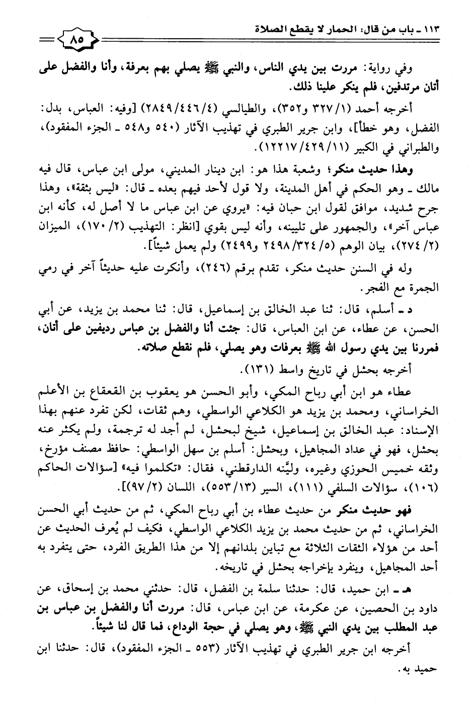 هـ - ابن حميد، قال: حدثنا سلمة بن الفضل، قال: حدثني محمد بن إسحاق، عن داود بن الحصين، عن عكرمة، عن ابن عباس، قال: مررت أنا والفضل بن عباس بن عبد المطلب بين يدي النبي - صلى الله عليه وسلم -، وهو يصلي في حجة الوداع، فما قال لنا شيئًا.