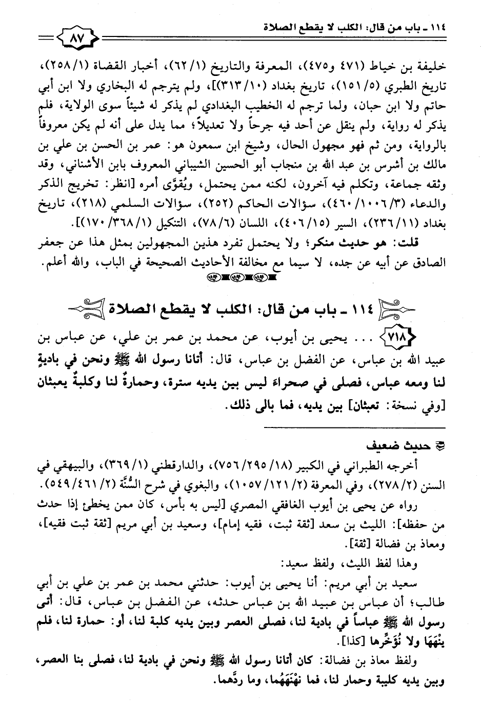 ٧١٨ - . . . يحيى بن أيوب، عن محمد بن عمر بن علي، عن عباس بن عبيد الله بن عباس، عن الفضل بن عباس، قال: أتانا رسول الله - صلى الله عليه وسلم - ونحن في باديةٍ لنا ومعه عباس، فصلى في صحراءَ ليس بين يديه سترة، وحمارةٌ لنا وكلبةٌ يعبثان [وفي نسخة: تعبثان] بين يديه، فما بالى ذلك.