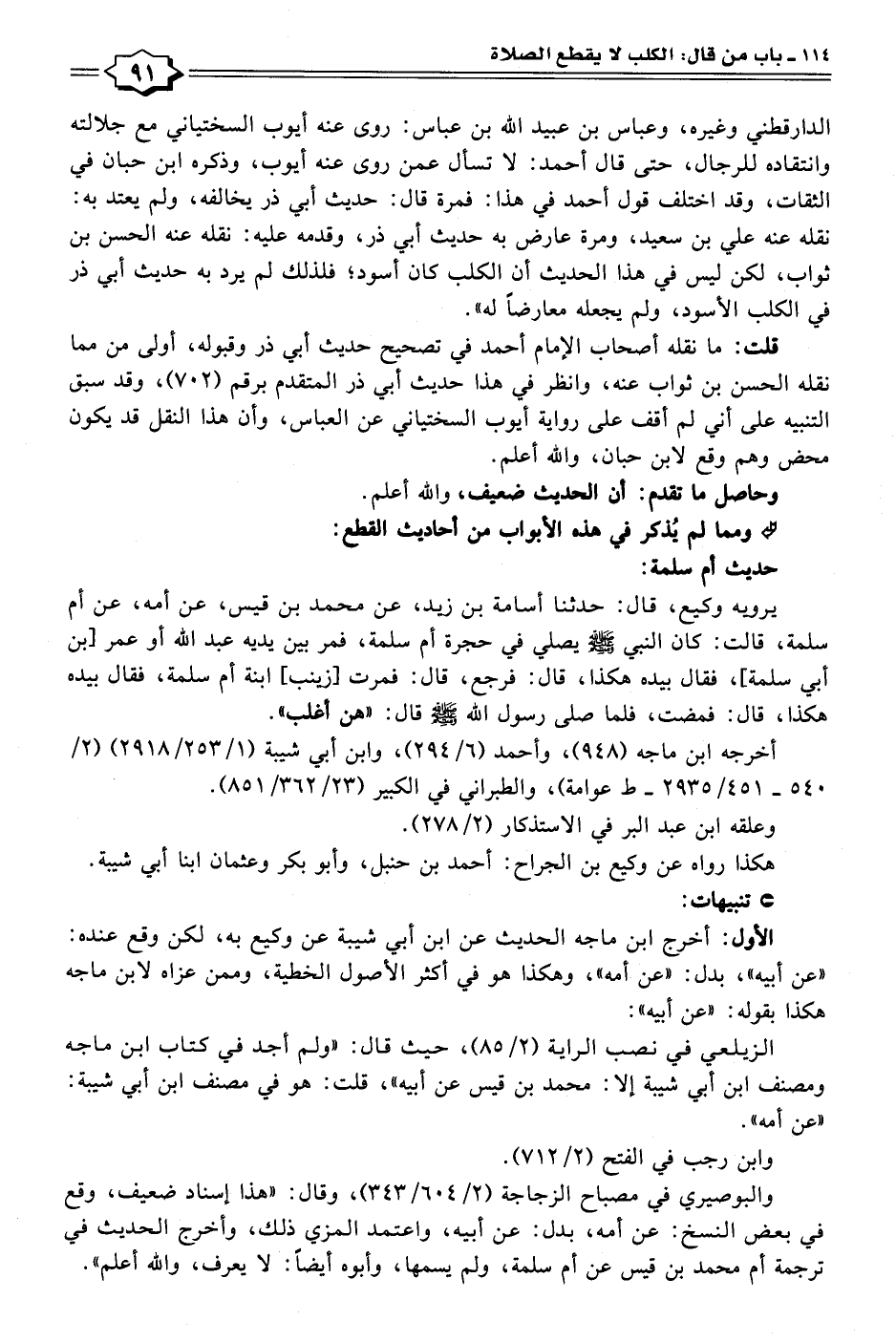 الدارقطني وغيره، وعباس بن عبيد الله بن عباس: روى عنه أيوب السختياني مع جلالته وانتقاده للرجال، حتى قال أحمد: لا تسأل عمن روى عنه أيوب، وذكره ابن حبان في الثقات، وقد اختلف قول أحمد في هذا: فمرة قال: حديث أبي ذر يخالفه، ولم يعتد به: نقله عنه علي بن سعيد، ومرة عارض به حديث أبي ذر، وقدمه عليه: نقله عنه الحسن بن ثواب، لكن ليس في هذا الحديث أن الكلب كان أسود؛ فلذلك لم يرد به حديث أبي ذر في الكلب الأسود، ولم يجعله معارضًا له".