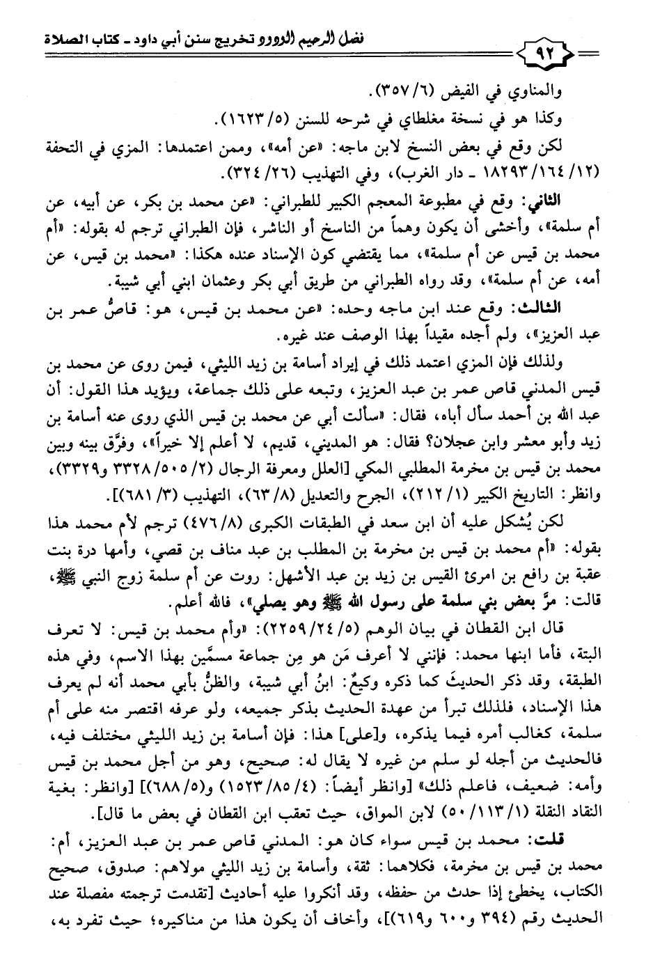 ولذلك فإن المزي اعتمد ذلك في إيراد أسامة بن زيد الليثي، فيمن روى عن محمد بن قيس المدني قاص عمر بن عبد العزيز، وتبعه على ذلك جماعة، ويؤيد هذا القول: أن عبد الله بن أحمد سأل أباه، فقال: "سألت أبي عن محمد بن قيس الذي روى عنه أسامة بن زيد وأبو معشر وابن عجلان؟ فقال: هو المديني، قديم، لا أعلم إلا خيرًا"، وفرَّق بينه وبين محمد بن قيس بن مخرمة المطلبي المكي [العلل ومعرفة الرجال (٢/ ٥٠٥/ ٣٣٢٨ و ٣٣٢٩)، وانظر: التاريخ الكبير (١/ ٢١٢)، الجرح والتعديل (٨/ ٦٣)، التهذيب (٣/ ٦٨١)].