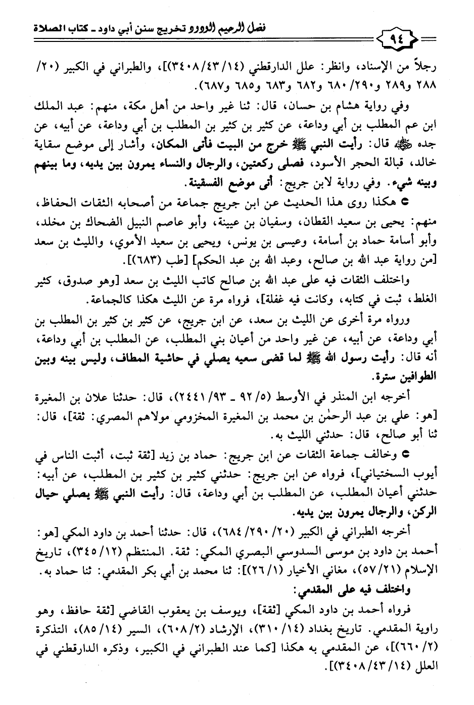 ورواه مرة أخرى عن الليث بن سعد، عن ابن جريج، عن كثير بن كثير بن المطلب بن أبي وداعة، عن أبيه، عن غير واحد من أعيان بني المطلب، عن المطلب بن أبي وداعة، أنه قال: رأيت رسول الله - صلى الله عليه وسلم - لما قضى سعيه يصلي في حاشية المطاف، وليس بينه وبين الطوافين سترة.